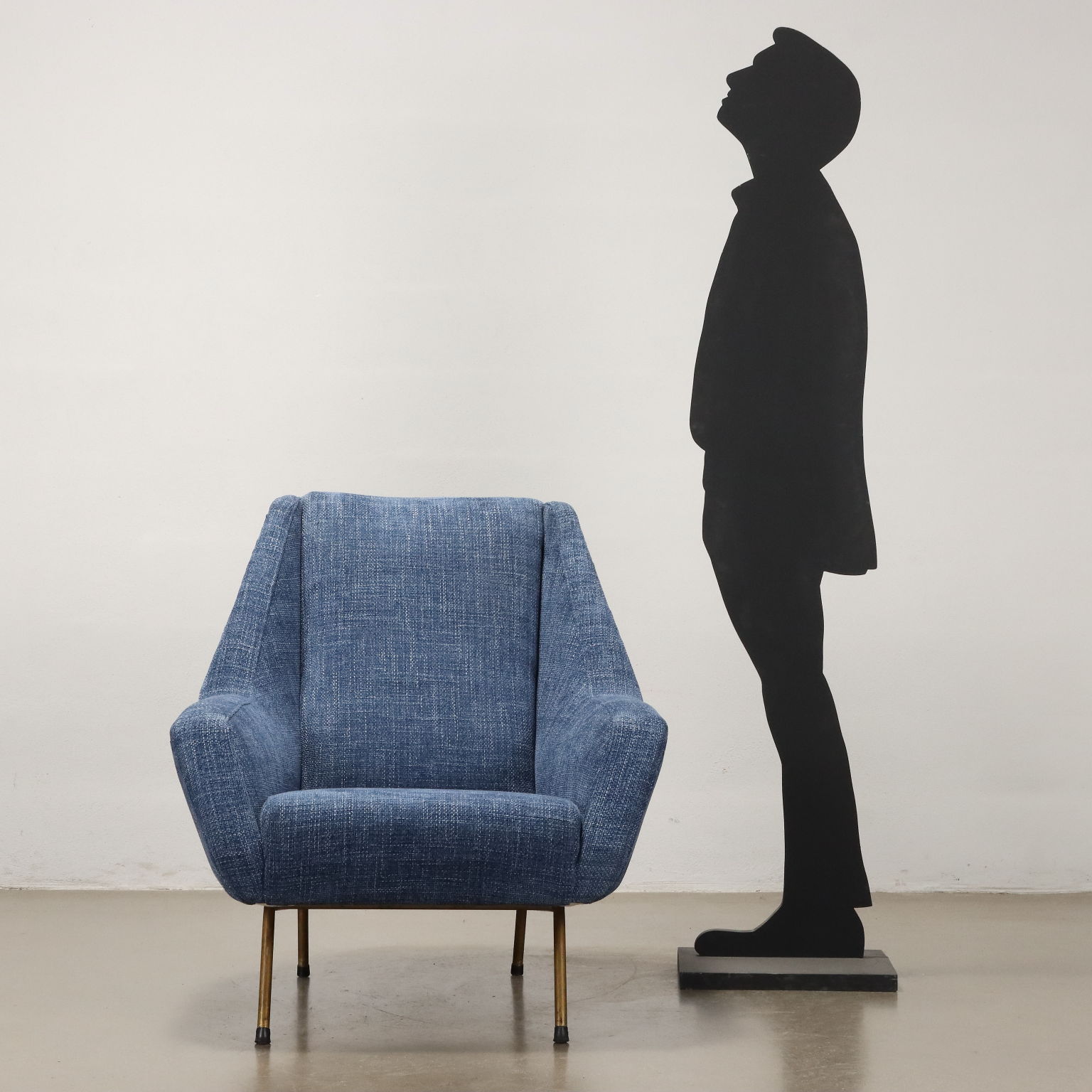 Armchair, foam padding, fabric covering, brass-plated metal legs. Restored. An armchair suitable for an environment with a relaxation area with an original style and a taste of nostalgia, the product has been carefully restored by our laboratory, with restoration work and replacement of the padding and fabric.