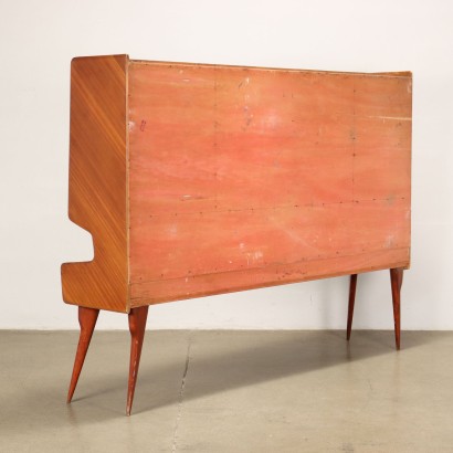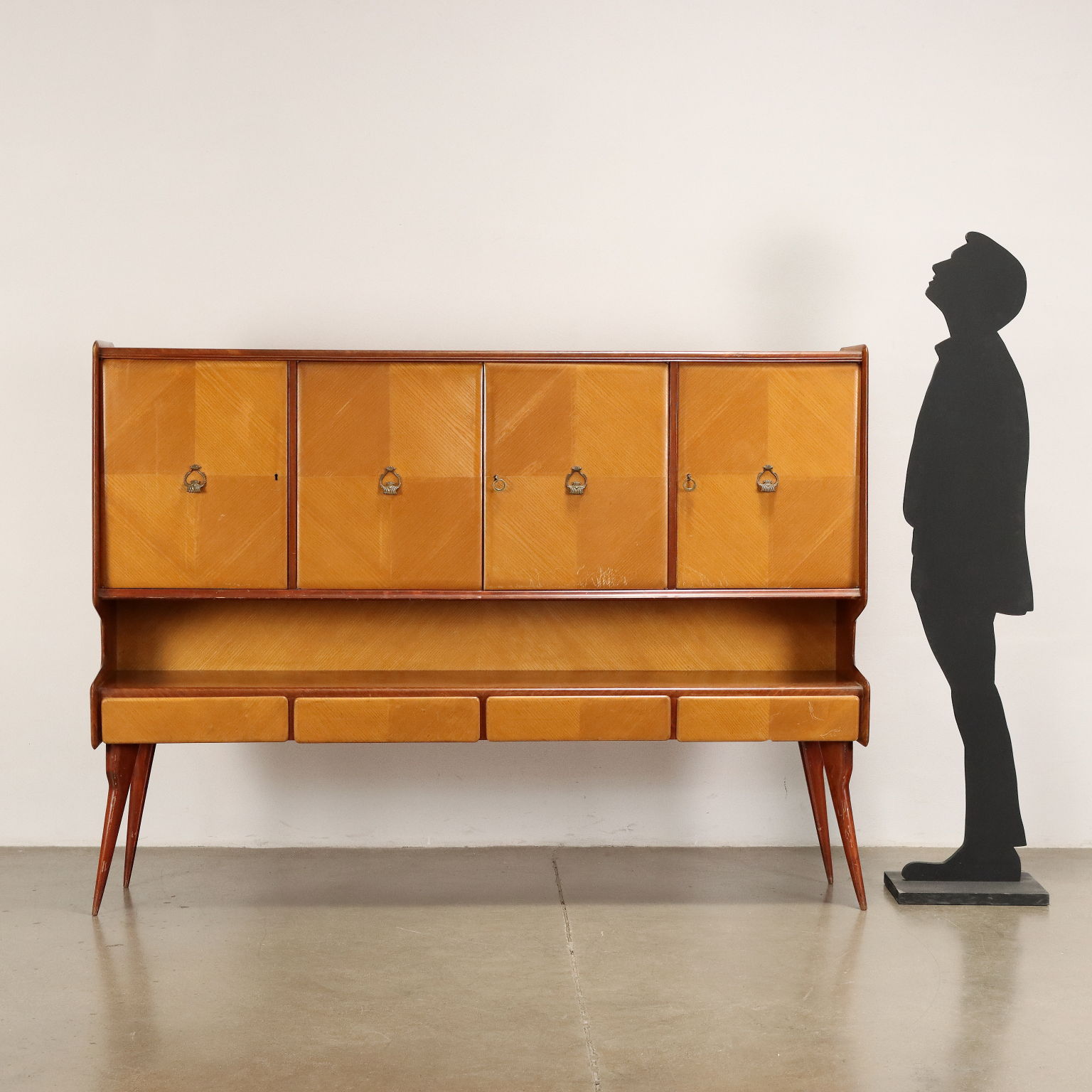 Sideboard with hinged doors and visible drawers; mahogany and maple veneered wood.