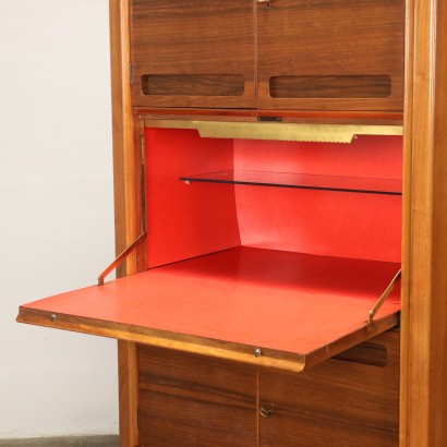Cabinet with hinged doors, desk compartment with flap and visible drawers; Tanganyika walnut veneered wood, brass legs.