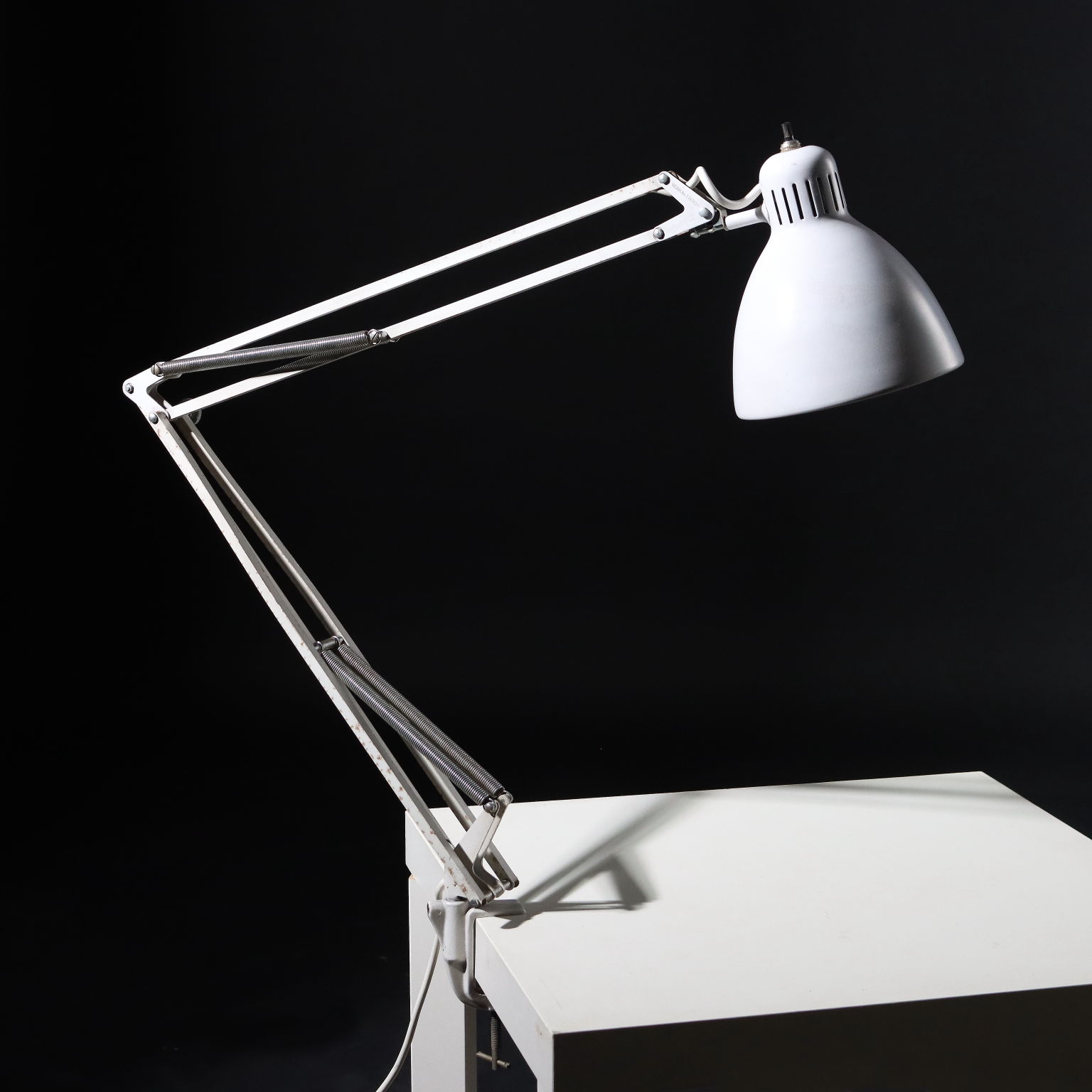 Adjustable table lamp made of enamelled metal and aluminium with clamp fastening.