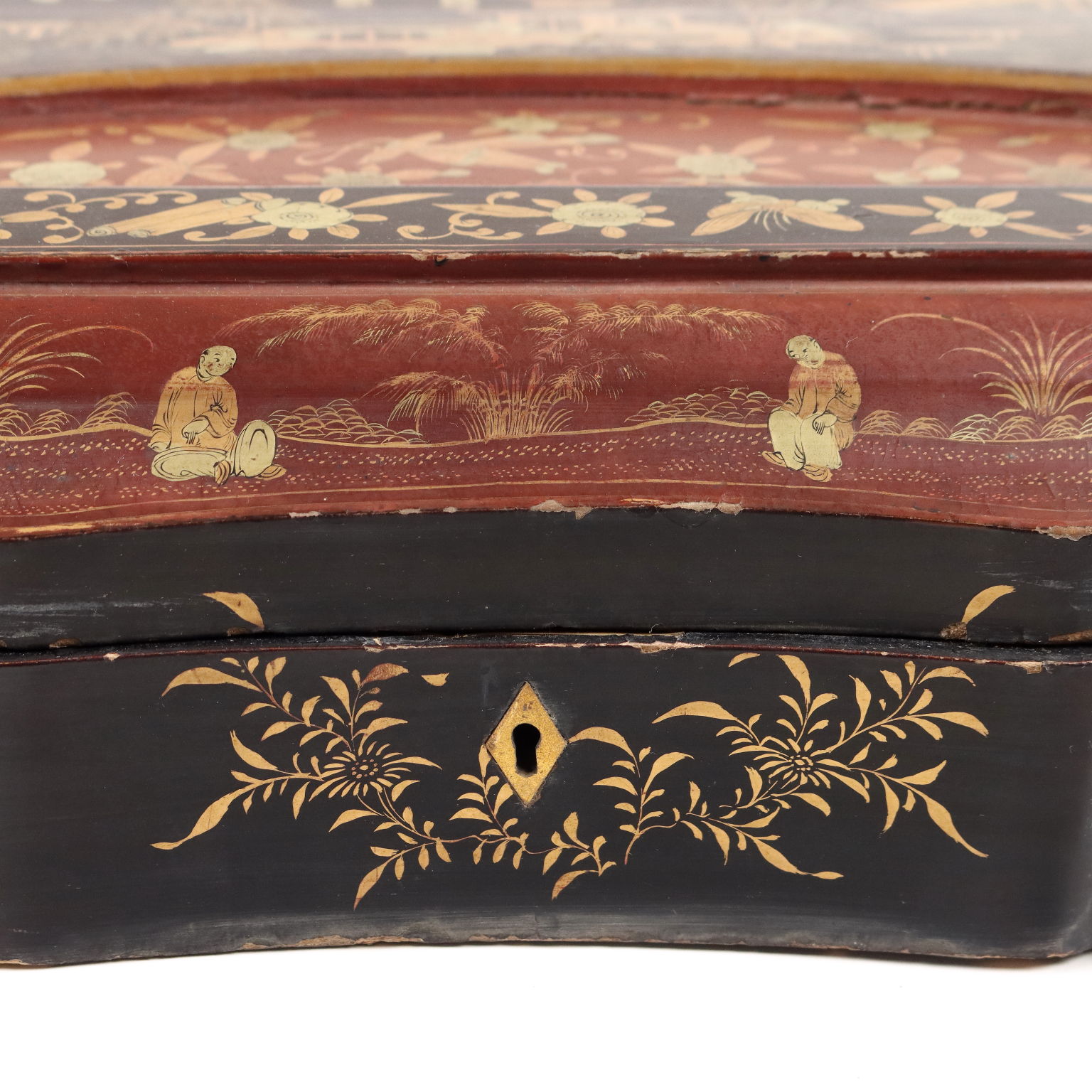 Rectangular polylobed wooden box, lacquered in cinnabar red and black painted in gold. Central decoration on the lid of various characters and buildings on a stilt house surrounded by water and rich vegetation. China Canton Qing period c.1890.