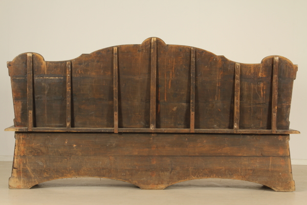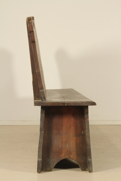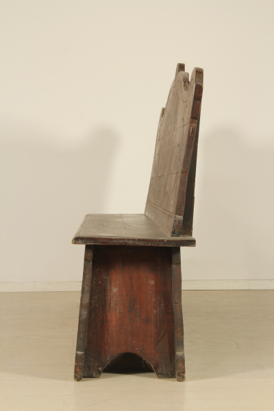 Carved rustic bench with backrest and seat. Cutouts in the front and the back.