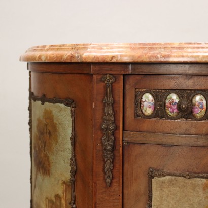 Cabinet with red marble top, front with small drawer decorated with painted bronzes and porcelains and two doors covered with printed canvas depicting a love scene and landscapes on the sides. Decorative bronzes and wavy legs with shoes.