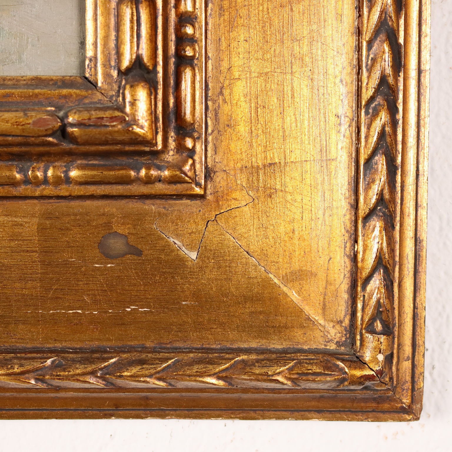 Oil on the table. Signed lower left. On the back the title in pencil and the label of the Galleria Pesaro in Milan. Intense glimpse of the sea played on a few color ranges, which draw on white and blue to create chromatic and light contrasts between sky and sea, in which even the small white sail in the center fits discreetly. Sala uses fast and broad, overlapping, impressionist brushstrokes. Paolo Sala, Milanese by birth and training, distinguished himself as one of the most important landscape painters of his period, as well as a landscape painter of the numerous Italian and foreign cities in which he worked. He preferred watercolors, but he also painted a lot in oils. The painting is presented in a period frame.