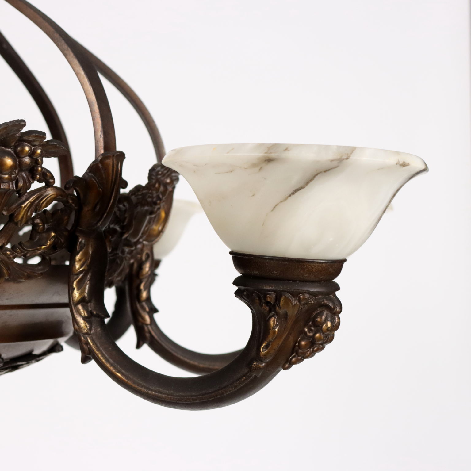Chandelier with 10 lights with bronze structure decorated with depictions of vases with fruit supporting a cup and arms with alabaster bobeches. Italy, early 20th century.
