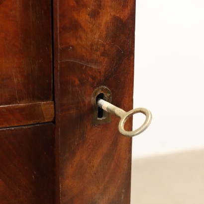 Small chest of drawers veneered in mahogany with front of eight drawers with bronze knobs depicting flowers and lateral pilaster with hinges and lock to block the drawers. Oak interior. France Second half of the 19th century