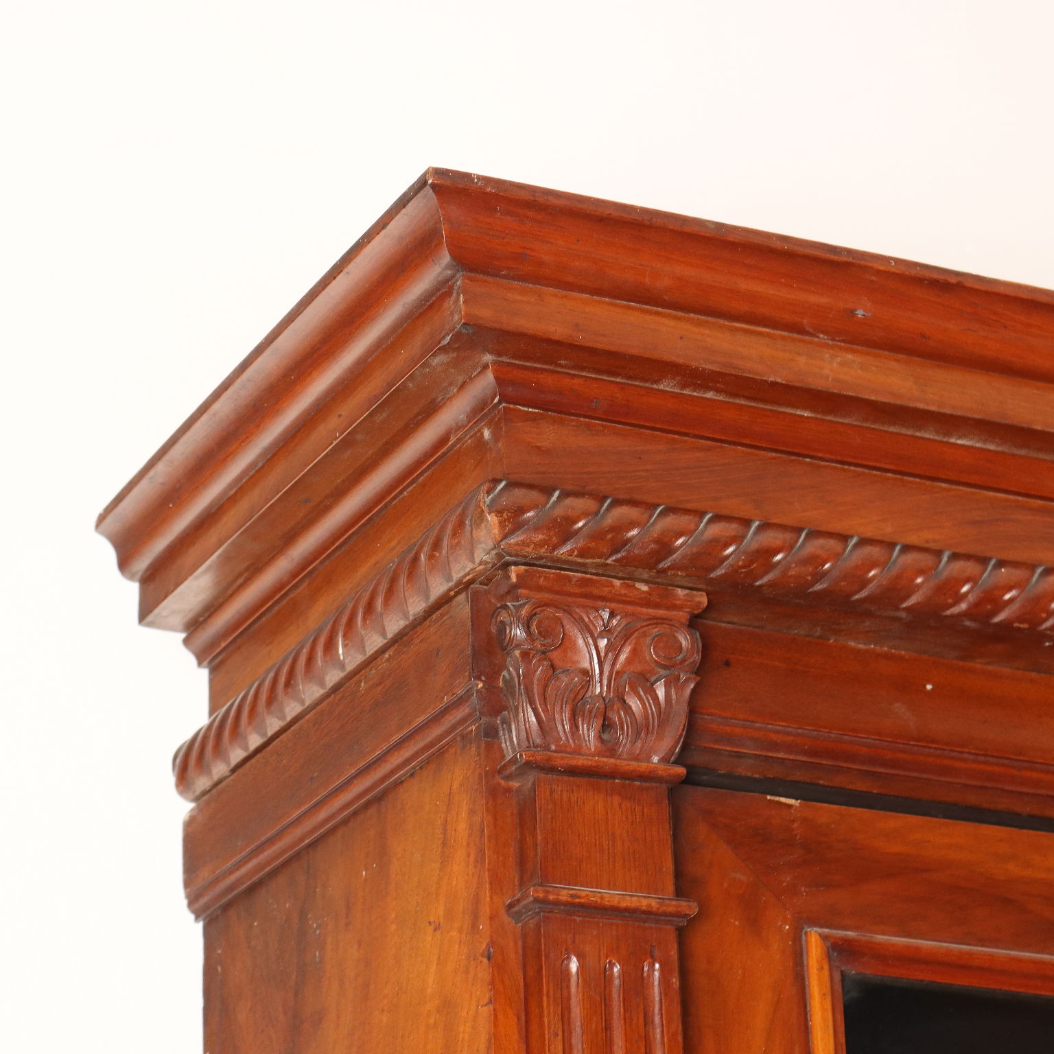 Large bookcase in walnut with top with carved rope band, front with four doors with blown glass display cases and pilasters with carved capitals and fluted shafts to divide the central pair from the two single side ones. Interior with height-adjustable shelves. Italy early 20th century