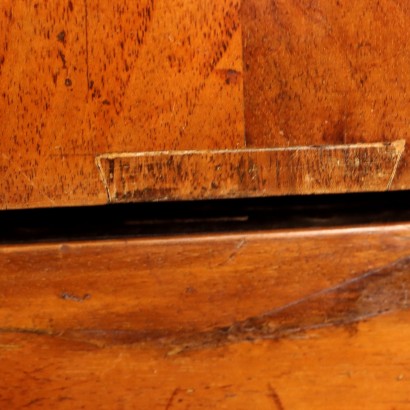 Empire chest of drawers in walnut and walnut slab, Italy, first quarter of the 19th century. Front with three drawers, the first of which in the projecting band, uprights with a pair of semi-columns, truncated pyramidal feet. Restorations.