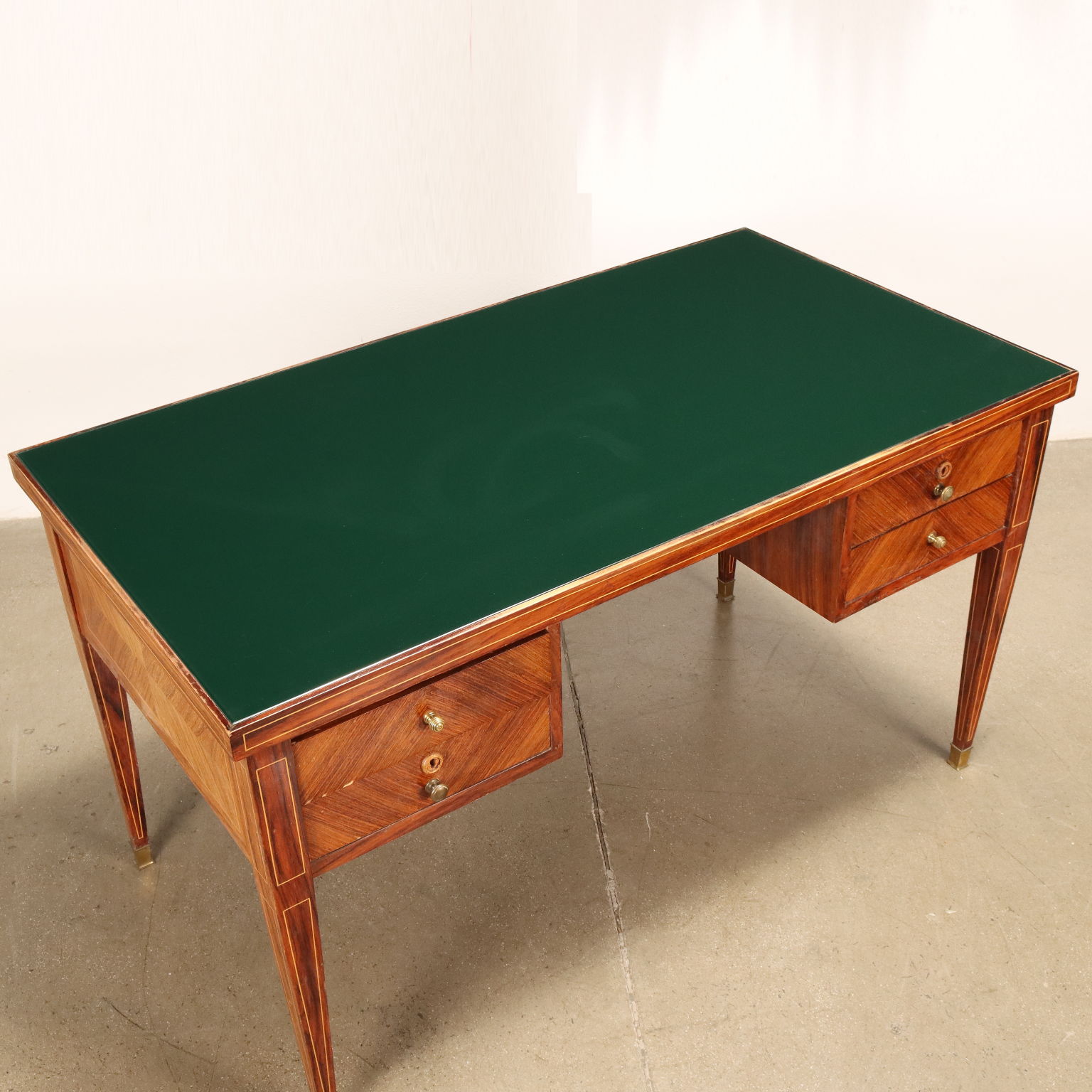 Elegant mid-20th century desk with double row of drawers, brass handles and tips and back-treated glass top in shades of green.