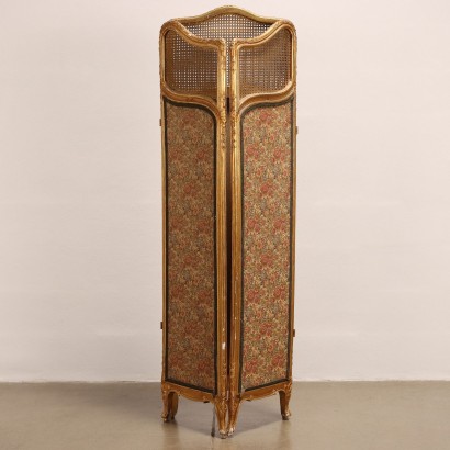 Carved and gilded wooden screen divided into three panels. The upper part is decorated with cannucciato and the lower part is in fabric embroidered with floral motifs. The entire structure is decorated with small rosettes and carved bellflowers. 20th century Italy