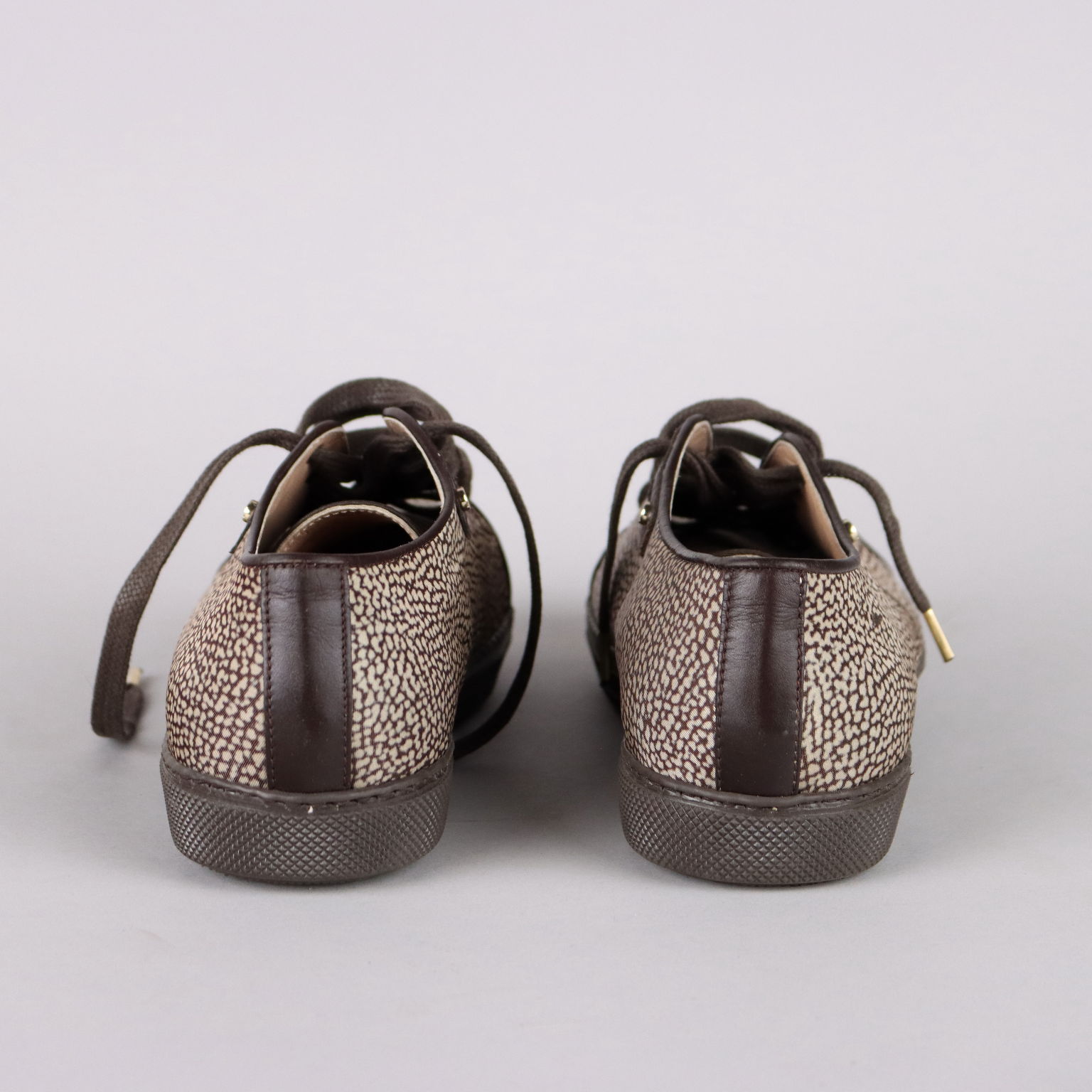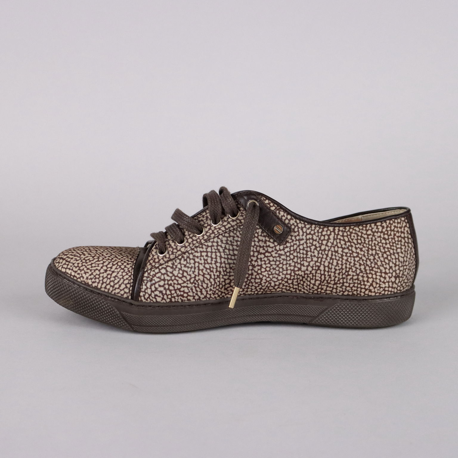 Sneaker by Borbonese, low in resistant Jet Nylon with brown OP print. Brown leather finishes. Probably never worn, in excellent condition. Size 39