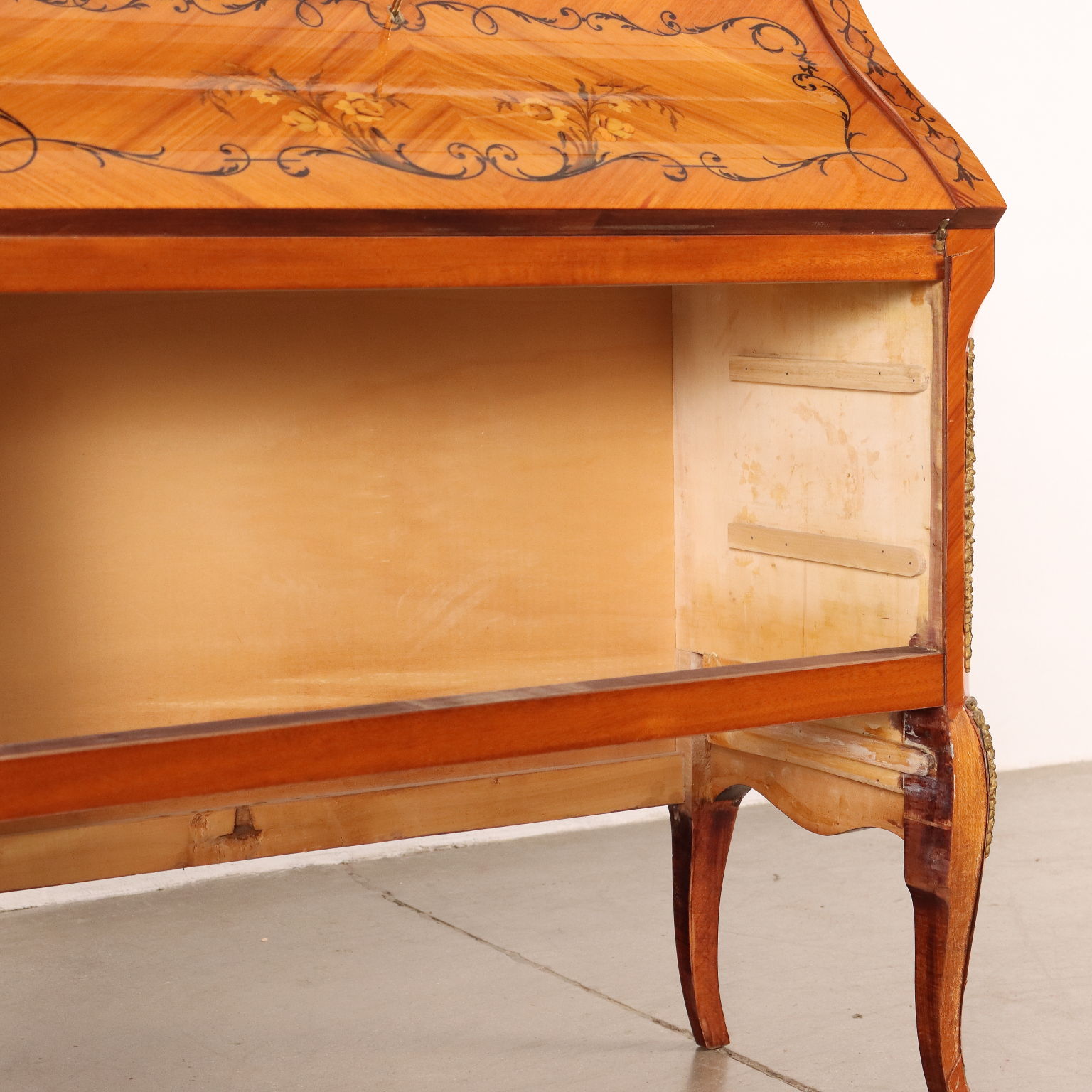 Inlaid flap with top bordered with bronzes, front with flap door concealing cabinet of drawers, two underlying drawers and shaped apron. The whole structure is veneered in bois de rose with floral inlays in maple and ebonized wood. Italy 20th century