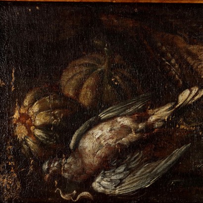 Oil painting on canvas. The composition proposes two game birds, resting on a surface together with two pumpkins. Restored and relined, the painting has several small drops of color, prevalent along the left and right margins. It is presented in a stylish frame.