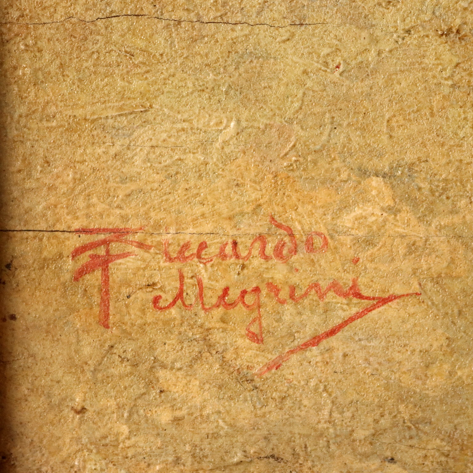 Oil on the table. Signed lower left. Further signature and date on the back. Riccardo Pellegrini, a Milanese painter, was a pupil of Domenico Morelli and trained in the climate of Romanticism. He was a landscape painter and genre painter, but he also created valuable still lifes, with bright colors and precise and realistic design. His landscape production drew on the various places he visited and lived in, in Italy and abroad, especially in Spain and France. In this work Pellegrini proposes a genre scene, a duel at dawn outside the walls of a garden, a rather typical theme of the romantic genre, especially literary. The dynamic figures of the duelists, engaged in the violent and bloody act of the duel, assisted by the godparents, contrast with the quiet of the garden and the delicacy of the flowering bushes. The plays of light and shadow play well, prolonging the shapes of the figures and the vegetation, already with meager outlines. The work is presented in a coeval frame.