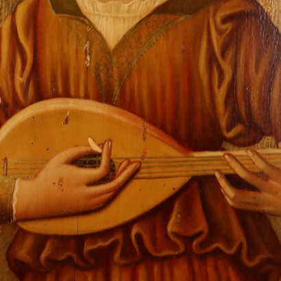 Panel paintings. Three painted wooden panels are placed in a carved and gilded wooden frame. The triptych is part of the large production of the late 1800s which resumed and re-proposed the medieval style, seen as a representation of purity and innocence, and therefore re-proposed as a model to imitate. Furthermore, it was only in the 19th century that restoration began to think in a historical perspective, trying to reintegrate the missing parts of the ancient works according to the style that it was believed could be the original one. The triptych presented here dates back to the end of the 14th-beginning of the 15th century: at the top center, the carving of the frame reproduces the Florentine coat of arms of the Medici family, corresponding in number of bezants (or balls) to the reign of Cosimo the Elder (1389 - 1464). In the three panels are depicted: in the center the Madonna with Child, similar in pictorial ways to the production of Sassetta (1392 -1450); on the sides two musician angels, one who sings with the text of the song in his hand, the other who accompanies him with the lute. The plates and the frame have small losses and falls of the colour.