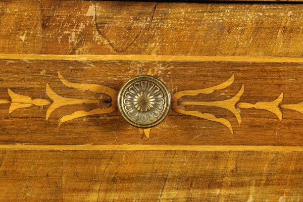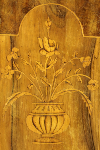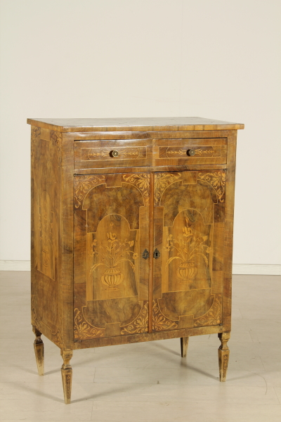 Inlaid sideboard with two doors and two drawers, pyramidal trunk, feet on the whole surface inlaid with floral and flower pots.