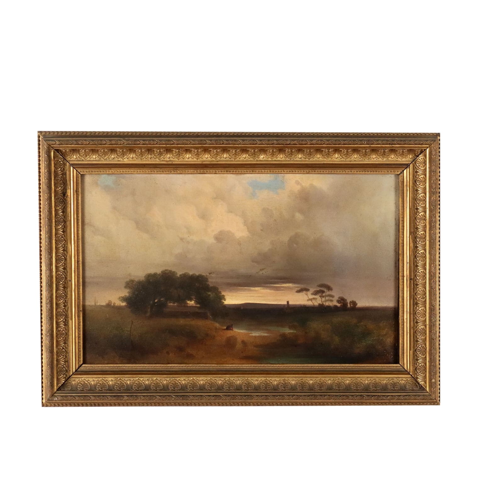 Oil on wooden board. Barely visible signature lower left. Gottardo Valentini, from Milan, dedicated himself almost exclusively to landscape painting, painting landscapes, often from Lombardy (snowy woods, autumn countryside) characterized by a late-romantic sensibility. Also in this landscape, a vast open countryside with the horizon reaching far to merge with the sky, the indistinct figure folded in on itself, alone near the pond, evokes a feeling of solitude, of pain, which the gray atmosphere , almost gloomy of the surrounding landscape, accompanies and underlines. The work is presented in a late 19th century frame.