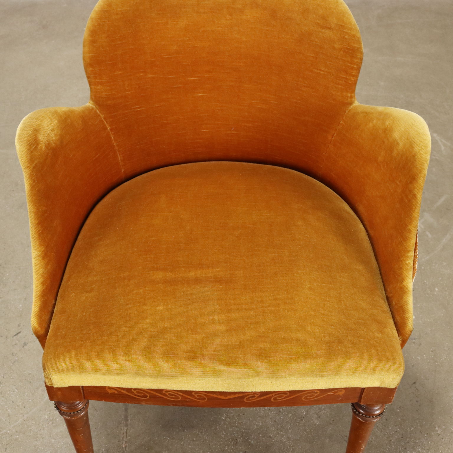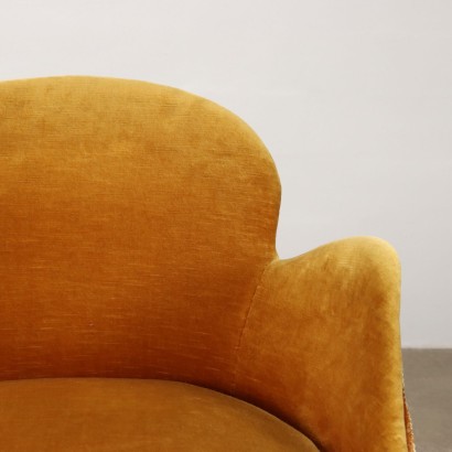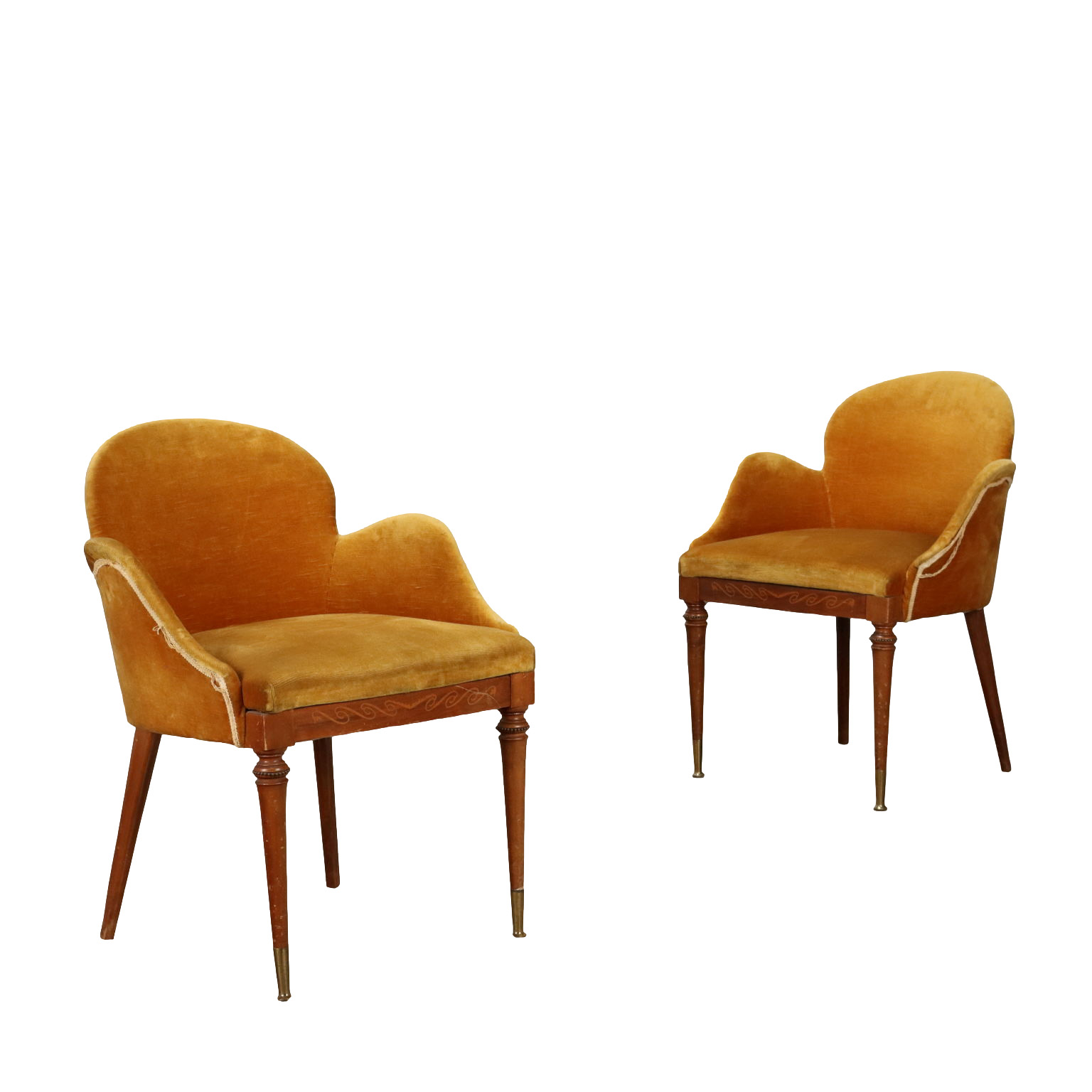 Pair of armchairs in stained beech wood with foam padding and velvet covering; a nice pair of armchairs to revisit to make them suitable for an environment that wants to take up an original style with a taste of yesteryear.