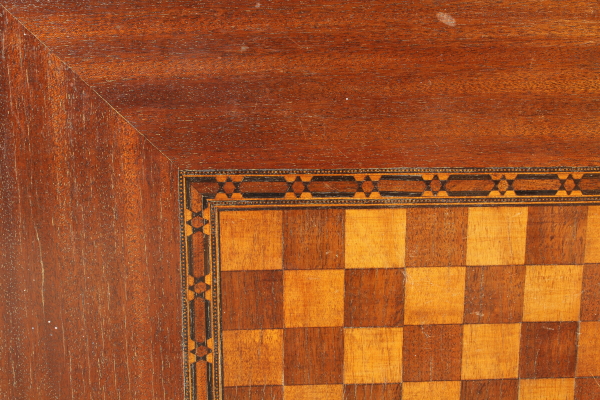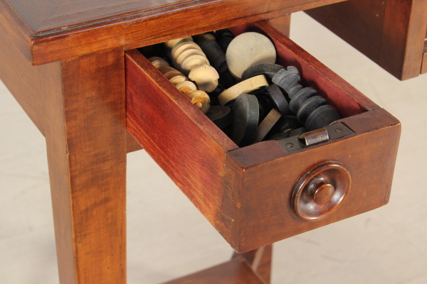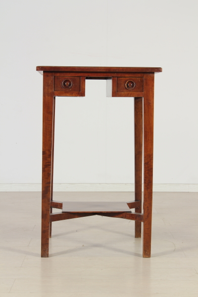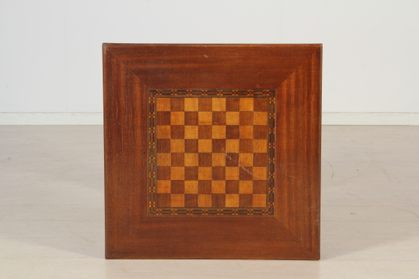 Coffee table with checkerboard with Conic legs connected with cruise. Two small drawers that can be opened from both sides. Floor with inlaid chessboard.