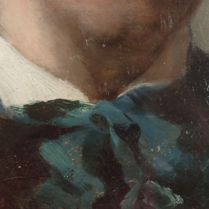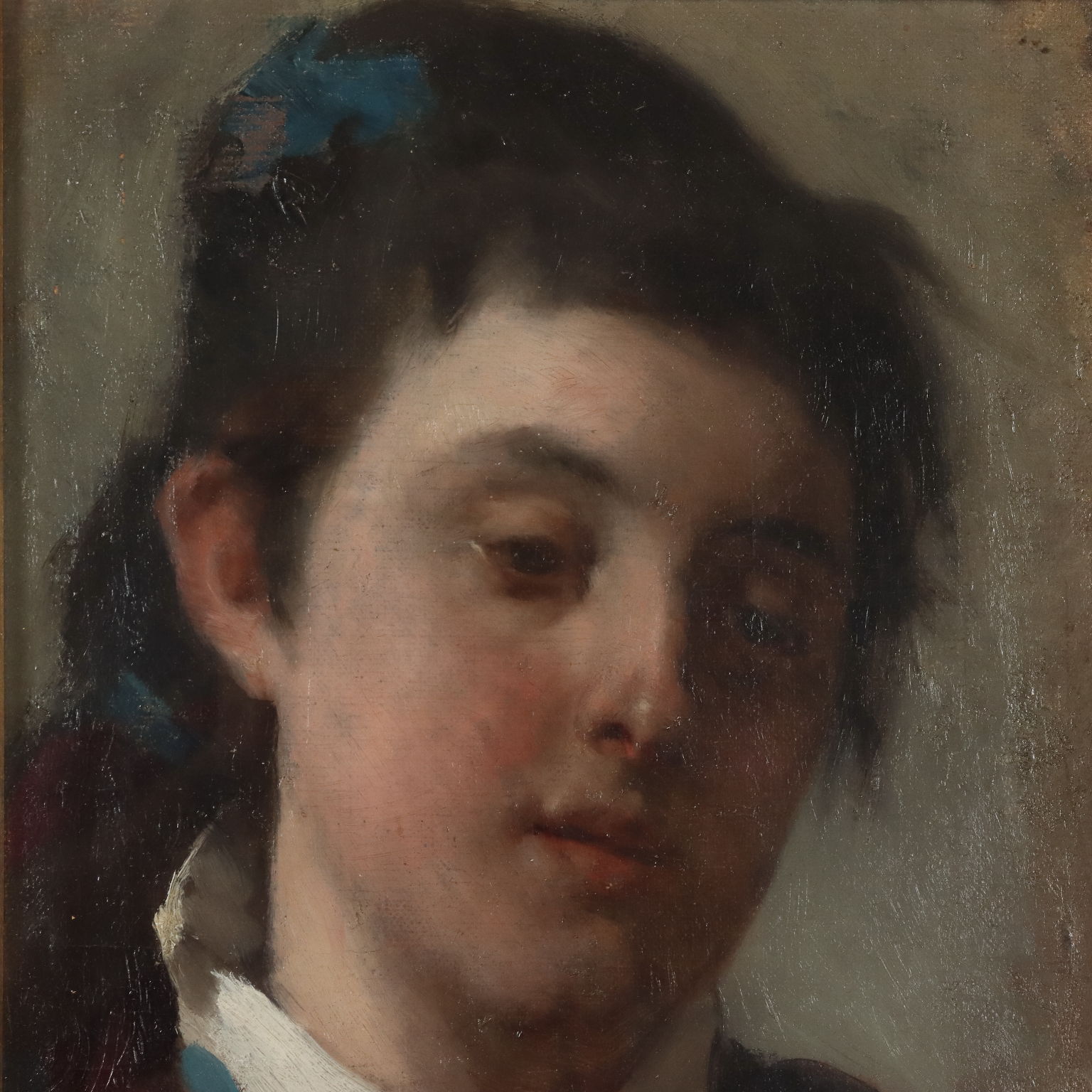 Oil painting on canvas. On the lower right there is the monogram LB, on the back the full signature and the date. Milanese by birth and training, Leonardo Bazzaro is considered a lively exponent of Lombard impressionism, dedicated to chromatic and luministic research. His very fruitful production of works was dedicated in the early years to Milanese interiors, but then attracted by open-air painting, he moved to landscape views and in particular he was attracted by the color of the Venetian lagoon, which led him to stay for a certain period in Chioggia. This face of a girl, a youthful work by the artist, only twenty-one years old, already highlights Bazzaro's ability to render color and light, which gives intensity to the absorbed expression of the young woman. The work is presented in a late 19th century frame.