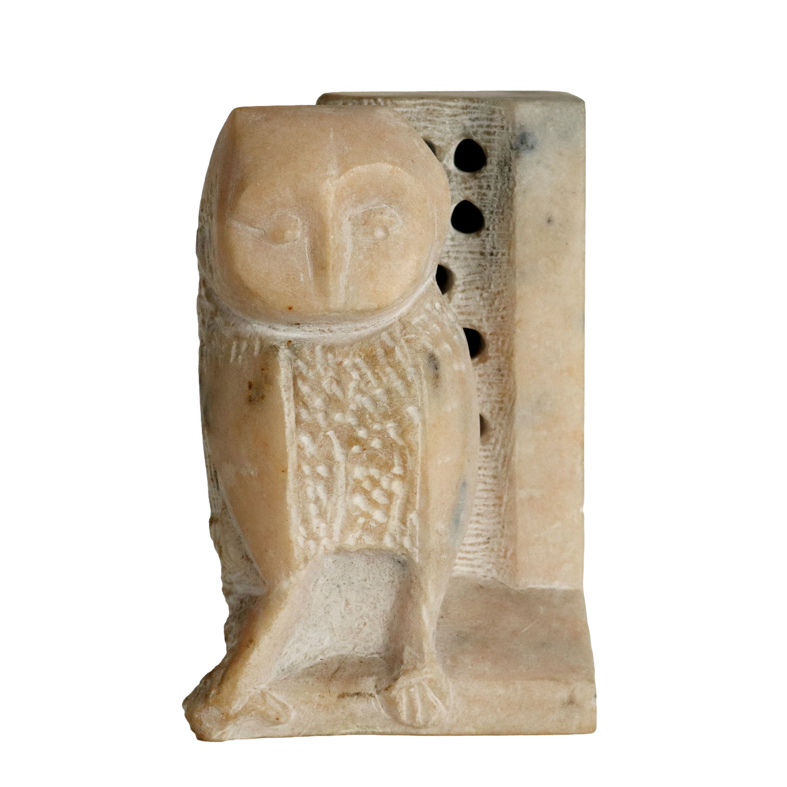 Marble sculpture. Signed on the lower right side. Mario Molteni, a Milanese artist, created his works almost exclusively with marble taken from the Candoglia quarries, near Verbania. His works often feature subjects drawn from classical culture, such as this owl, presented alongside abstract compositions, such as the shape with holes behind the bird.