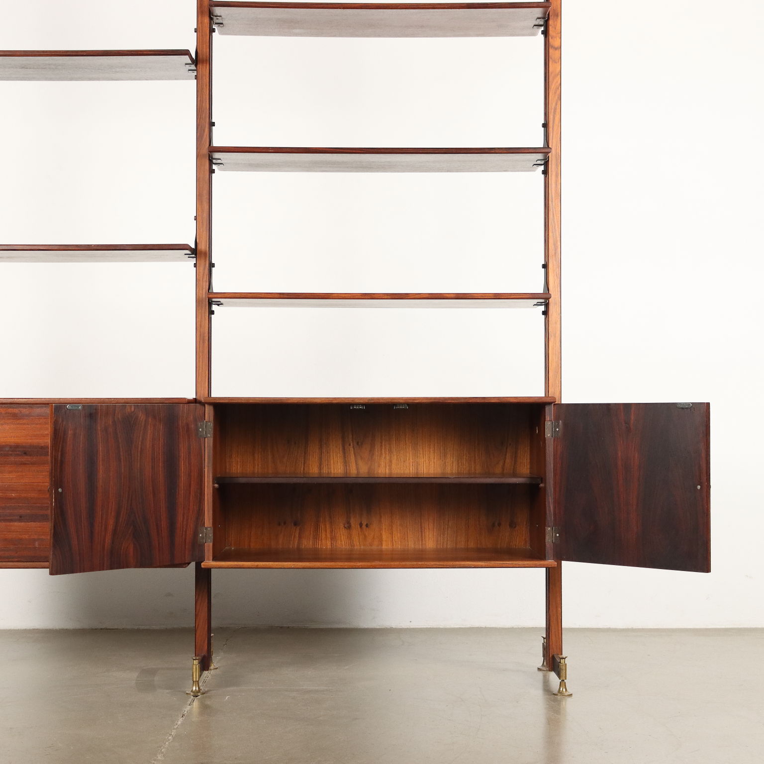 Description Vintage mid-20th century bookcase of Italian manufacture. Elegant brass feet support a two-span structure in exotic wood. It has adjustable position shelves and two compartments, one with drawers and one with hinged doors.