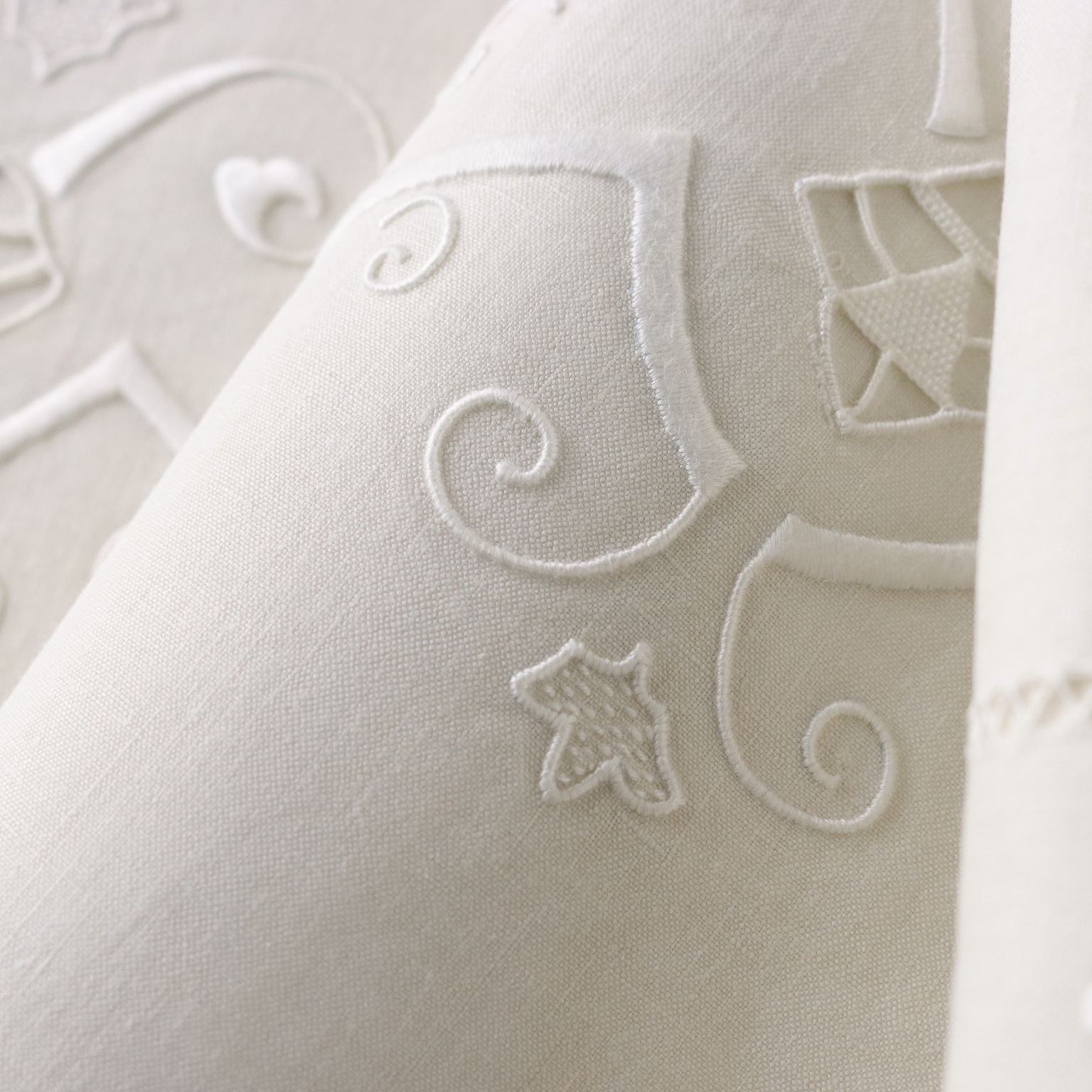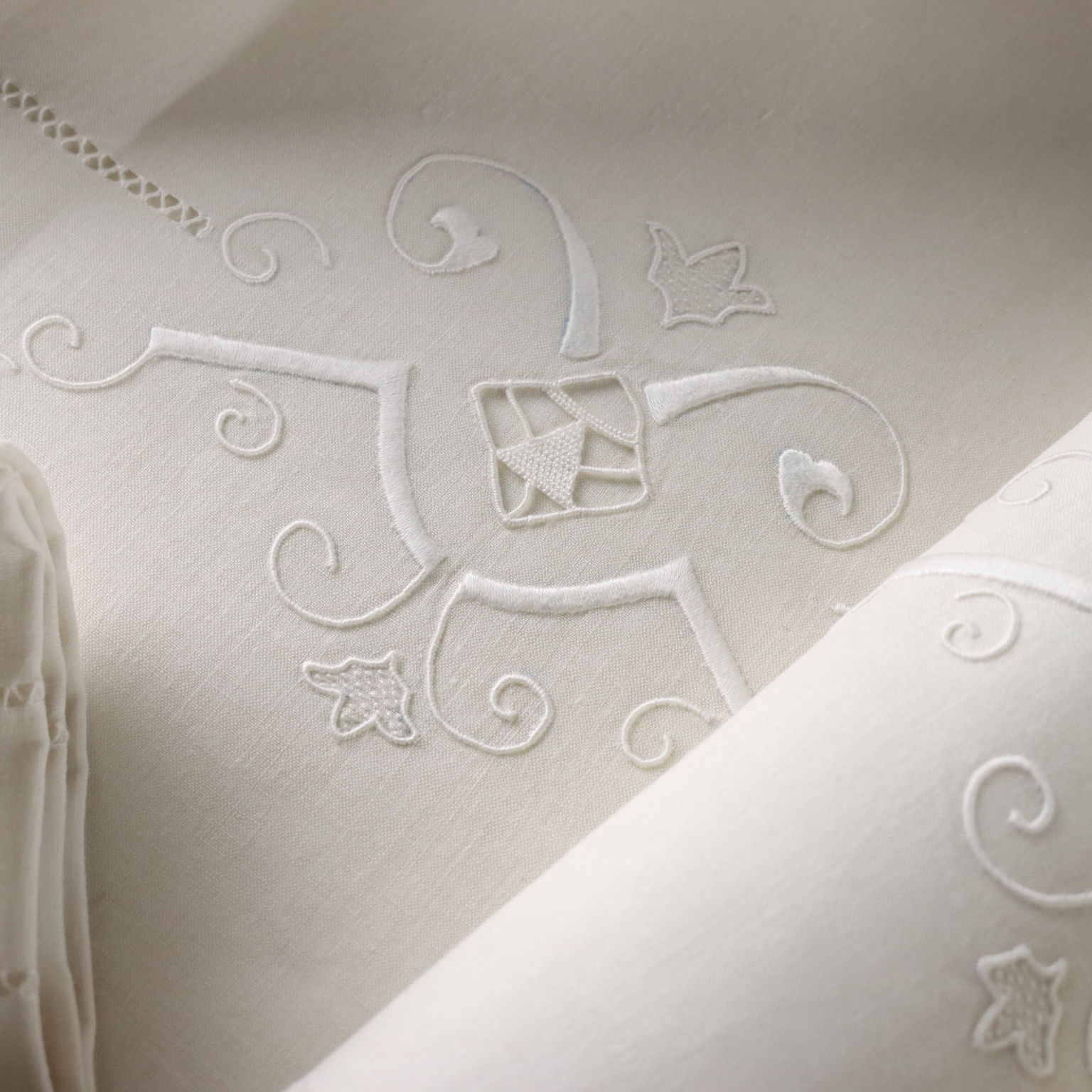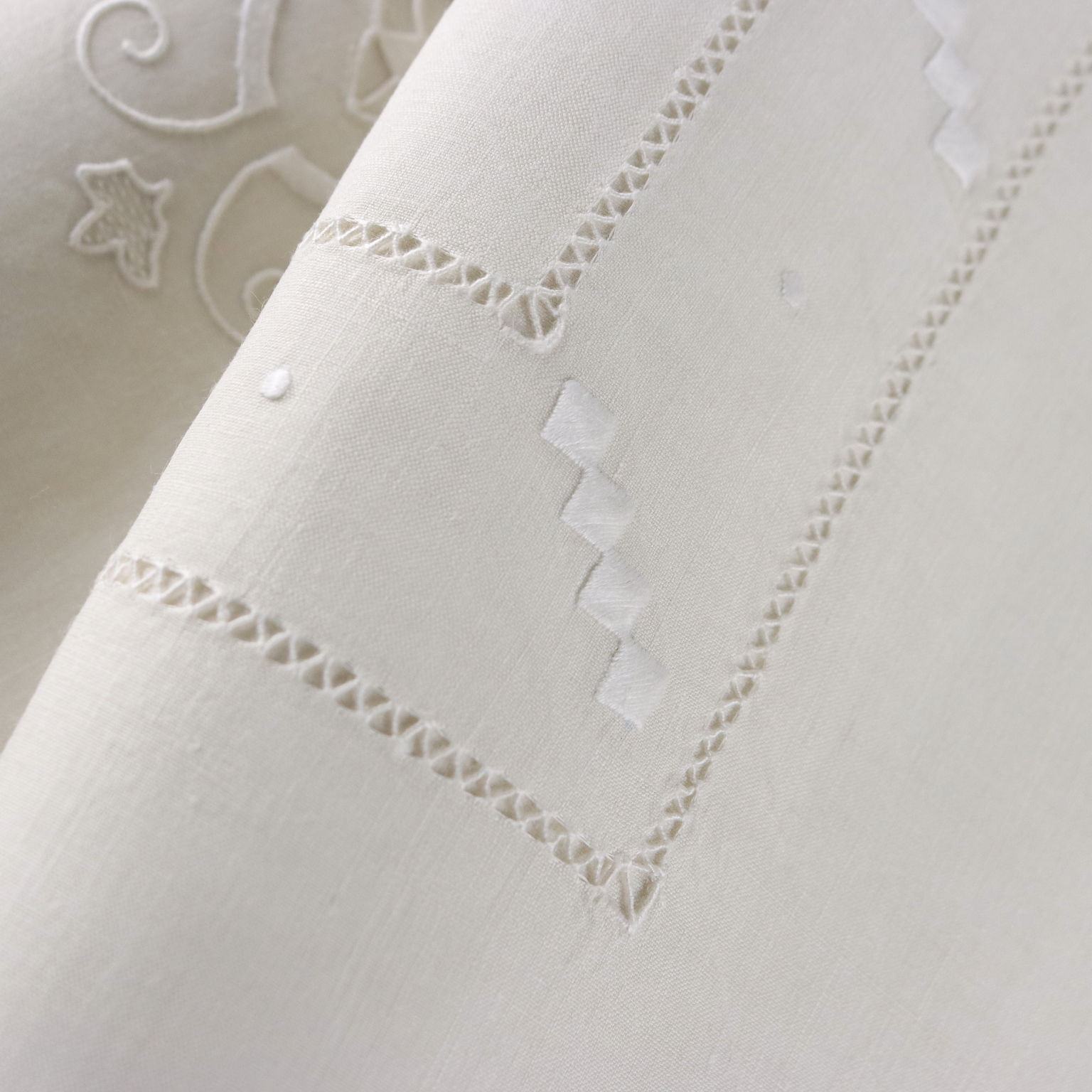 Double bed set with two pillowcases Elegant and refined reverse side embroidered with needle stitch and satin stitch which gives relief to the embroidery Small signs of aging Cream white color Linen composition Dimensions Sheet 280 cm x 266 cm Pillowcases 82 cm x 52 cm