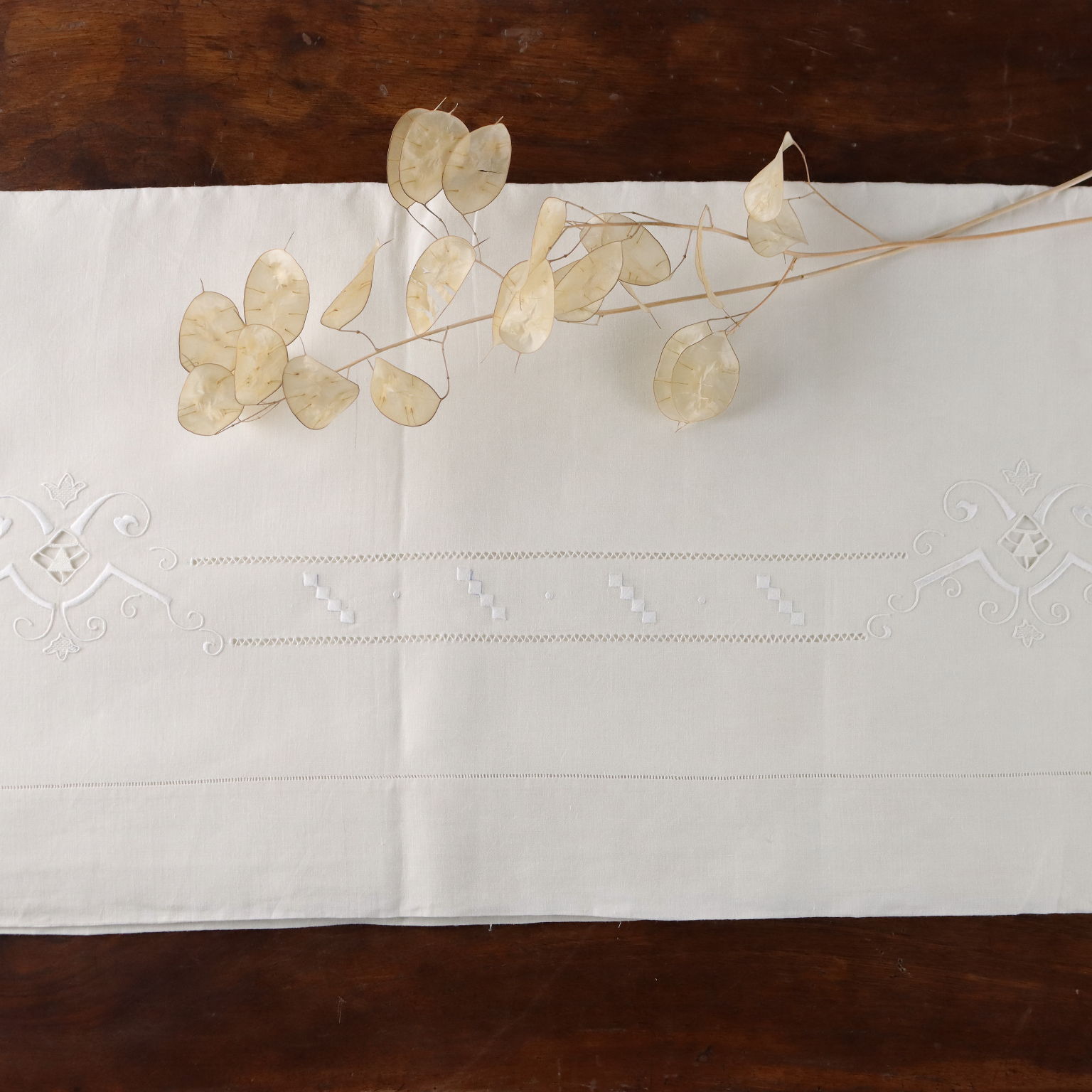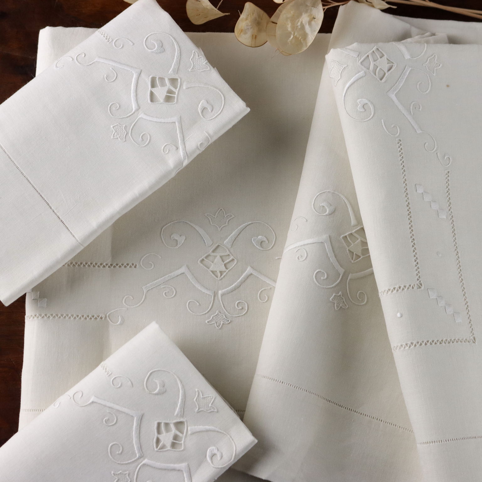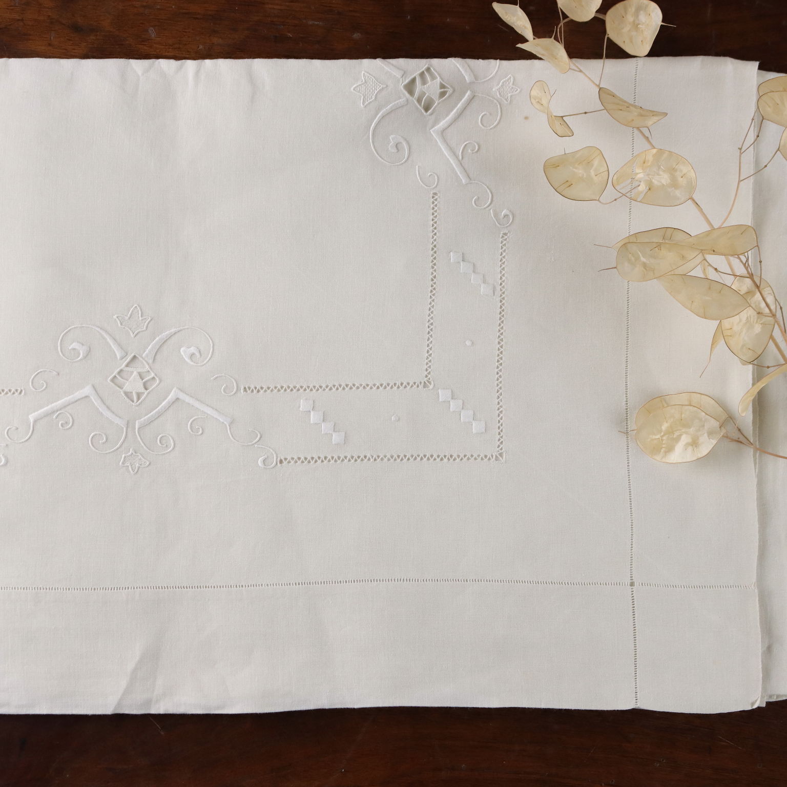 Double bed set with two pillowcases Elegant and refined reverse side embroidered with needle stitch and satin stitch which gives relief to the embroidery Small signs of aging Cream white color Linen composition Dimensions Sheet 280 cm x 266 cm Pillowcases 82 cm x 52 cm