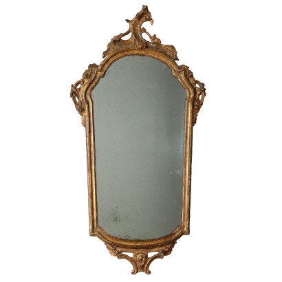 Mirror with gilded and carved wooden frame, decorated with curl motifs and rocaille elements also present on the cymatium. Mercury mirror. Italy mid-18th century
