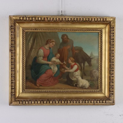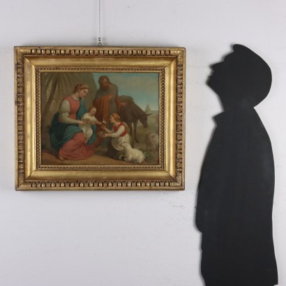 Oil on canvas. Central European School of the 19th century. The Holy Family, in very domestic and simple clothing, are standing outside a tent in a deserted area, which the pyramid at the bottom left allows us to place in Egypt, the place of the family's exile during Herod's persecution. A young shepherdess is honouring the Child with a lily, symbol of purity, and a basket of fruit, whose red colour is meant to allude to the Passion. Next to the human figures are the farmyard animals of the characters' domestic life, the family's faithful donkey and the girl's sheep. The work is presented in a carved and gilded wooden frame.