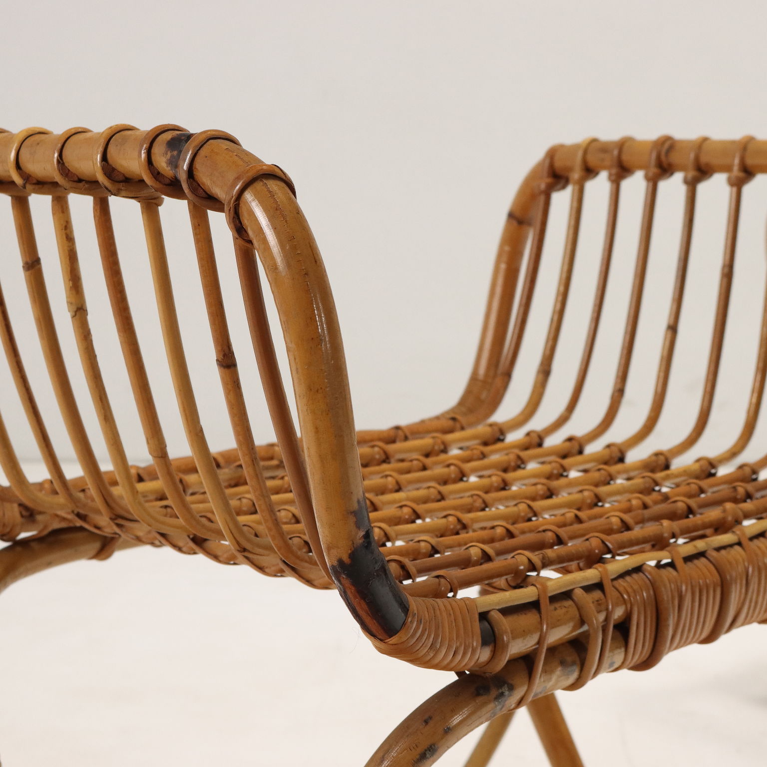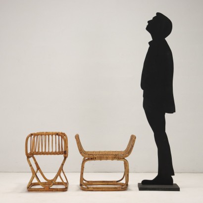 Pair of Italian-made footrests or stools with bamboo structure and woven rope seat.