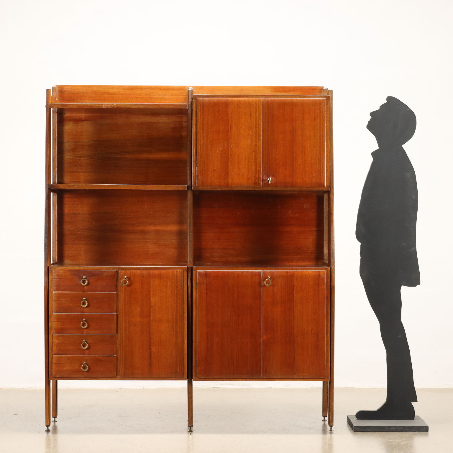 Description Vintage Italian-made piece of furniture with storage compartments and open compartments in mahogany veneered wood and beech uprights.