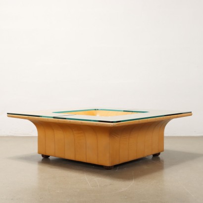 Coffee table with base in lacquered wood and covered in leather, the top is in glass with a central hole. Has chips on the glass top.