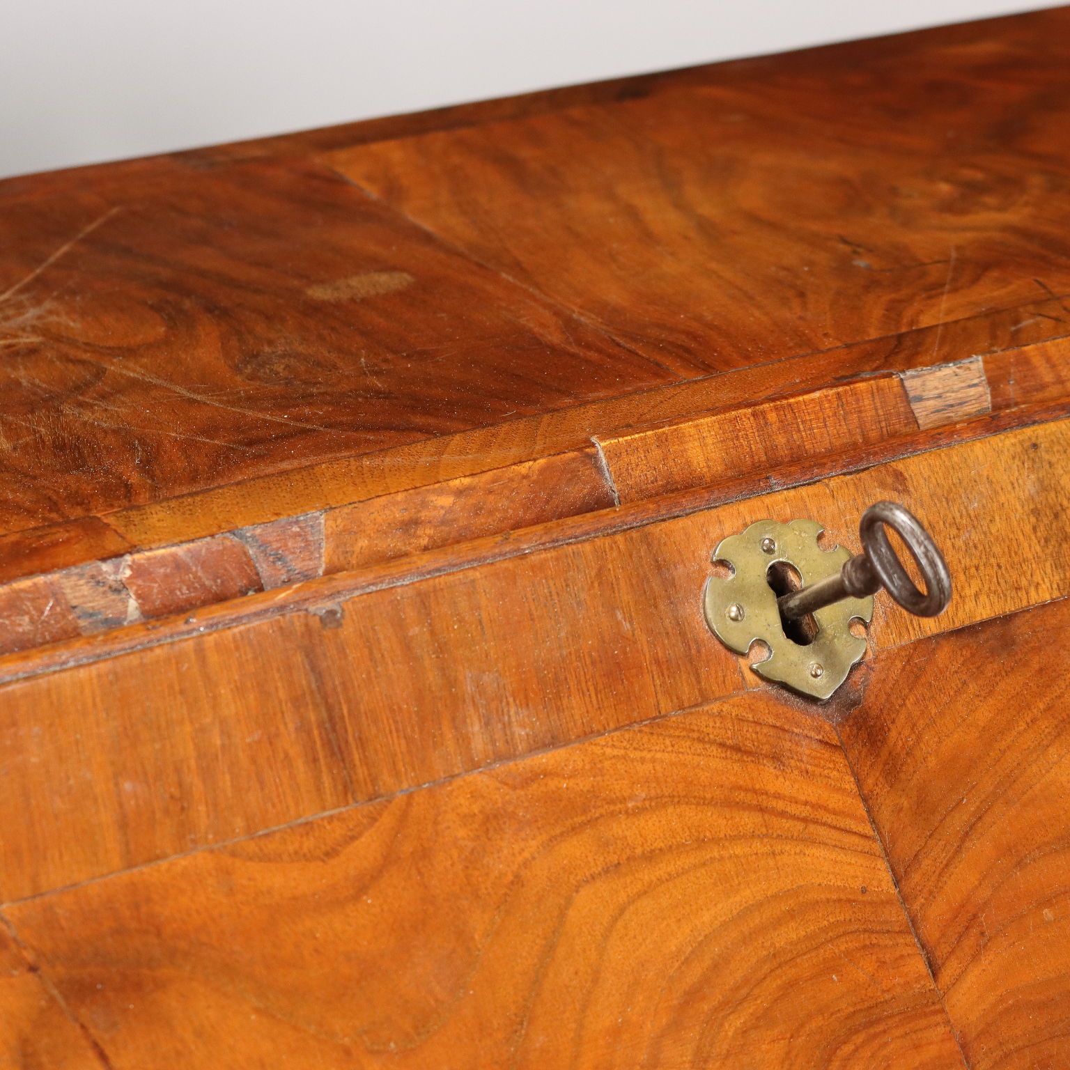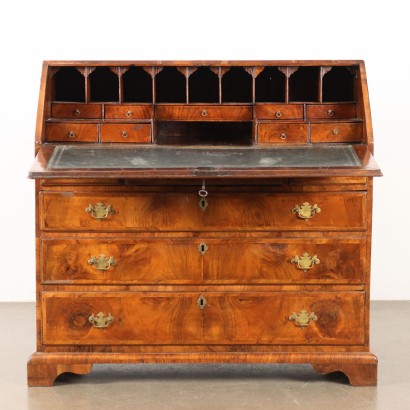 Flap supported by shelf feet, has three drawers plus three in the upper band, surmounted by a folding door concealing a cabinet with desk top, small drawers and document compartments. In walnut, the interior is in oak.