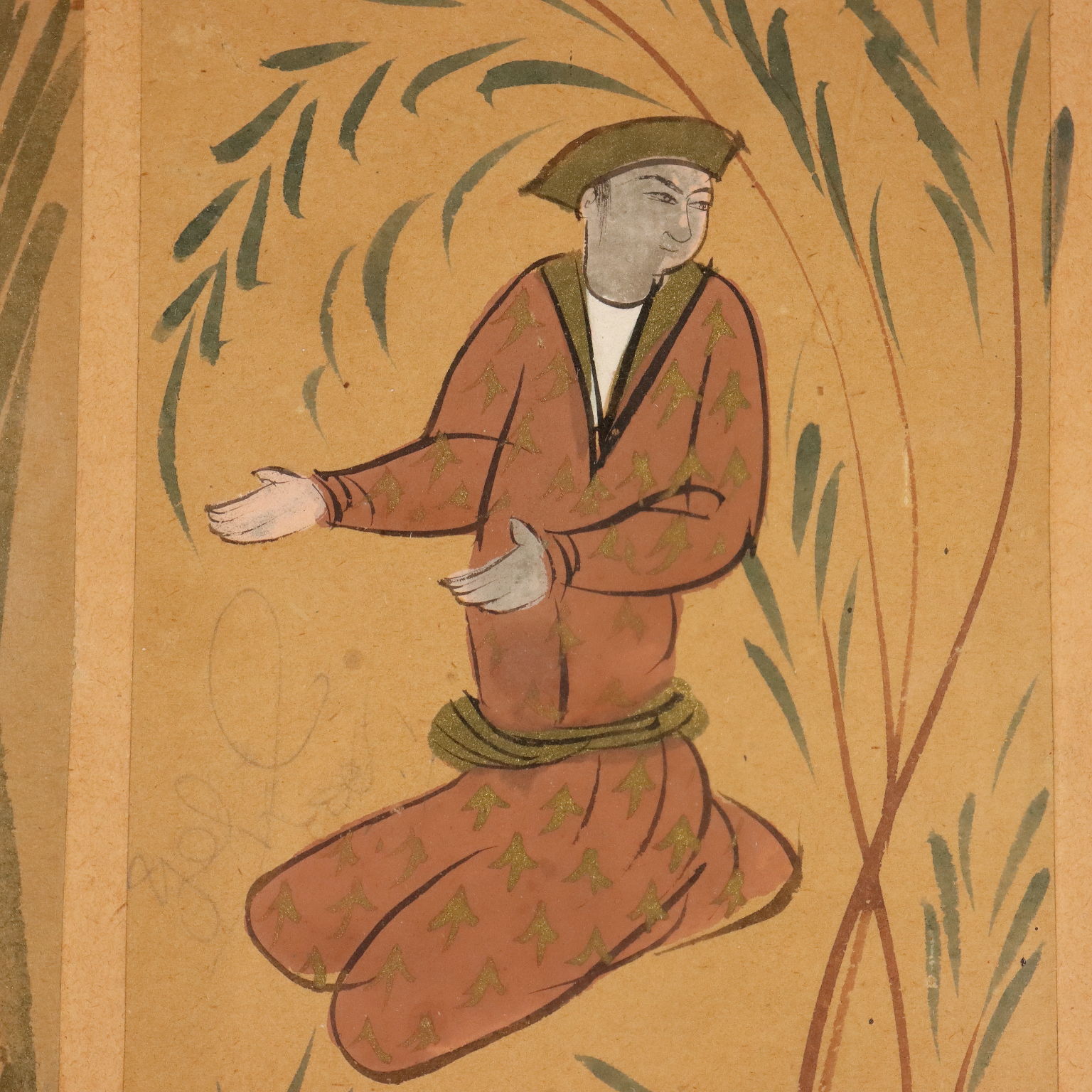 Paintings on paper. Asia, first half of the 20th century. The miniatures depict six male characters, intent on different activities, painted in imitation of the style of Reza Abbasi, Persian miniaturist, painter and calligrapher (1565 – 1635). The figures are inscribed in an applied paper frame, and surrounded by monochromatic leaf and floral decorations. They are presented in stylish frames.