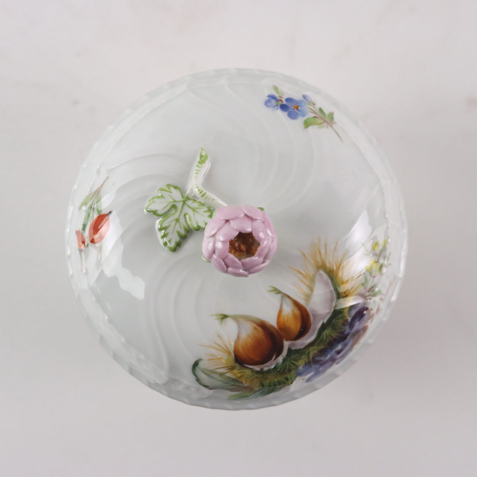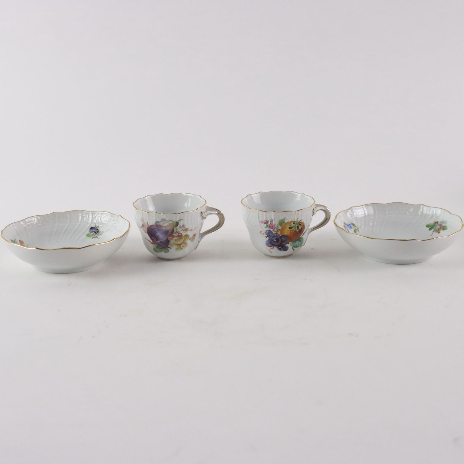 Coffee set Meissen manufacture with polychrome decorations of flowers and fruit on a white porcelain background decorated in relief. Gold highlights and manufacturer's mark under the bases. The service consists of a coffee pot, sugar bowl, milk jug and eight cups with saucers.