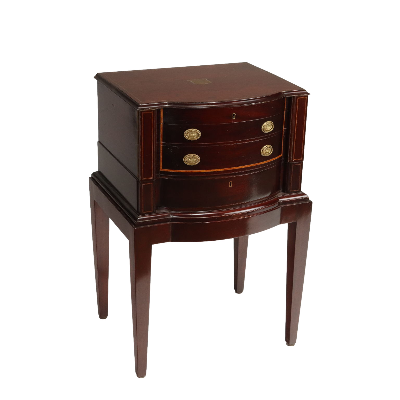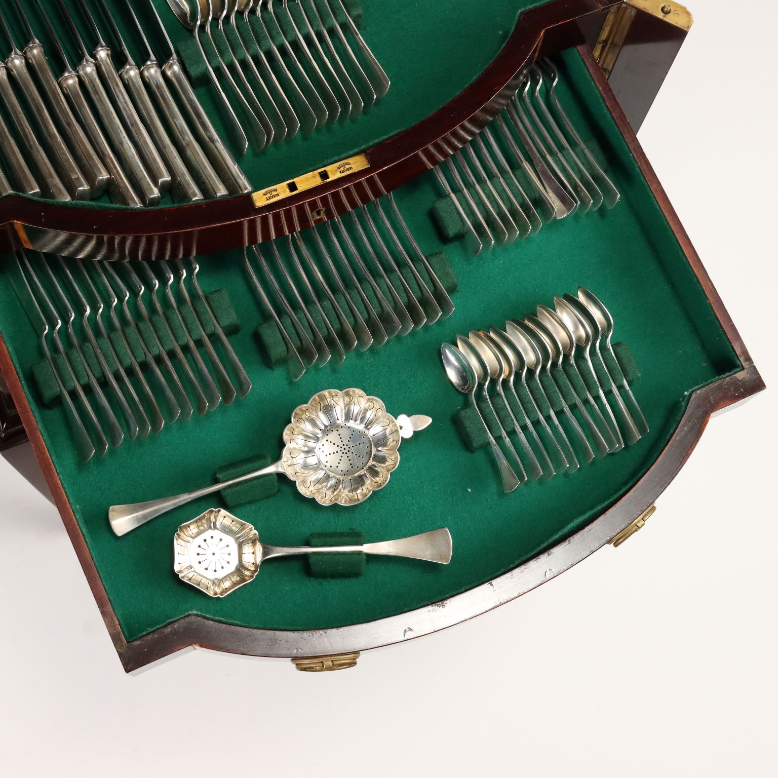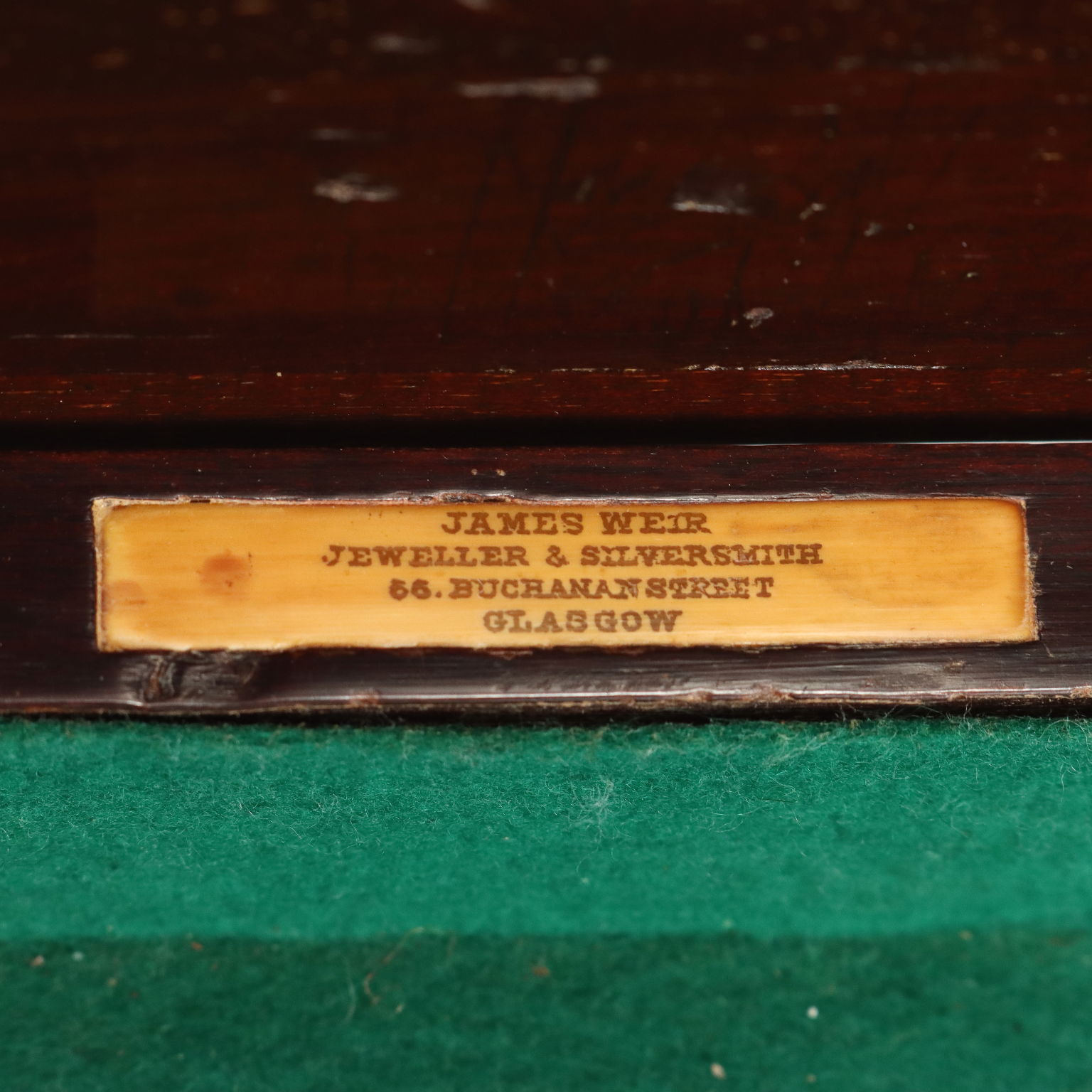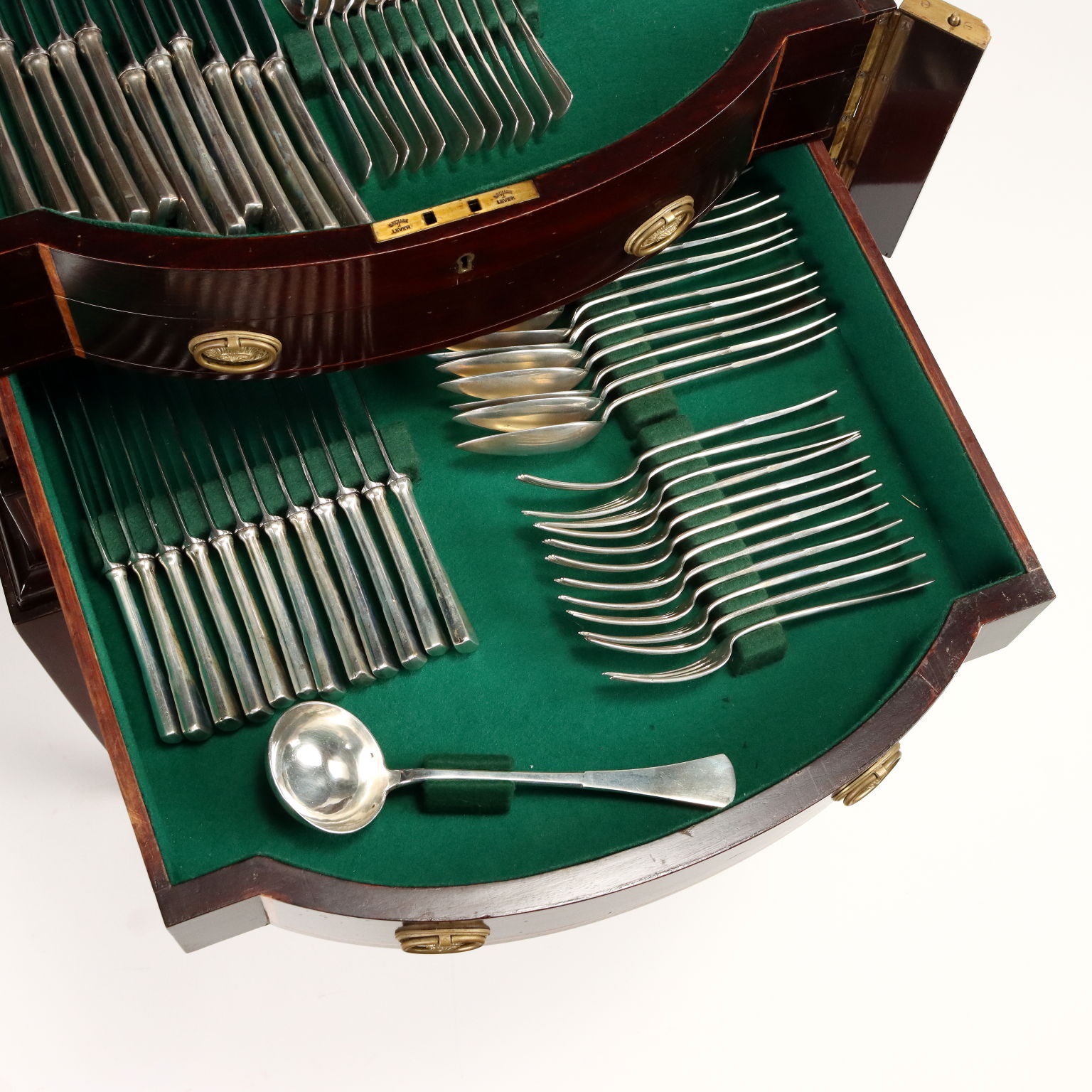 Silver cutlery set with initials engraved on the handles, composed of 16 serving cutlery, 12 spoons, 12 forks, 12 knives, 12 fruit forks, 12 fruit knives, 12 dessert spoons, 12 dessert forks, 12 dessert knives sweet, 12 teaspoons. 6035 grams net of the 24 knives. Marks of silver incussi. The service is kept in a mahogany cabinet with a wavy front and three drawers, the top of which, embellished with a brass insert, can be opened and conceals an additional cutlery compartment. The body can be separated from the truncated pyramidal legs. The front and top of the small chest of drawers are embellished with maple and dark wood threads, while only the first has a bois de rose border. On the sides of the front two small doors allow you to block the drawers. Locks marked Lever and internal label bearing the name of the manufacturer "James Weir Jeweler & Silversmith 66 Buchanan Street Glasgow".