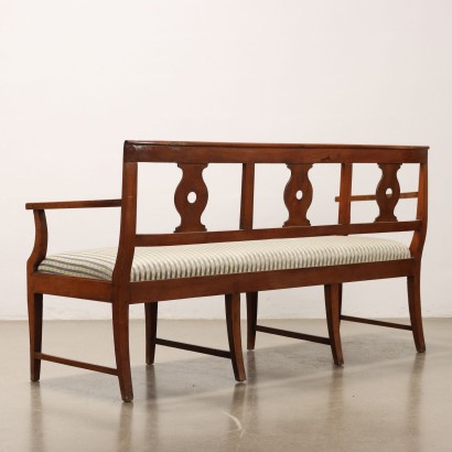 Directoire sofa in walnut, Italy, late 18th - early 19th century. Open backrest with shaped panels with a perforated circular central motif. Padded seat. Saber-shaped hind legs.