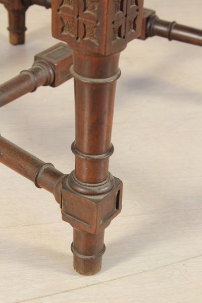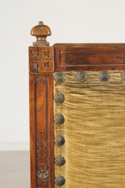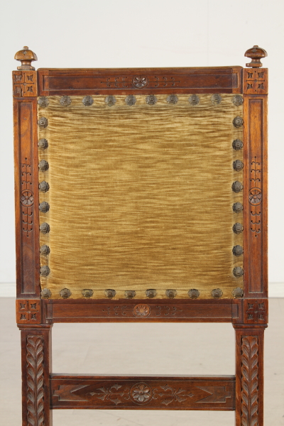 Straight chairs on turned legs and carved connected by stringers. Seat and backrest upholstered.