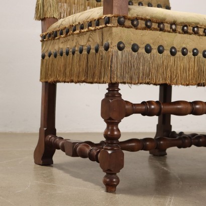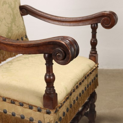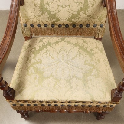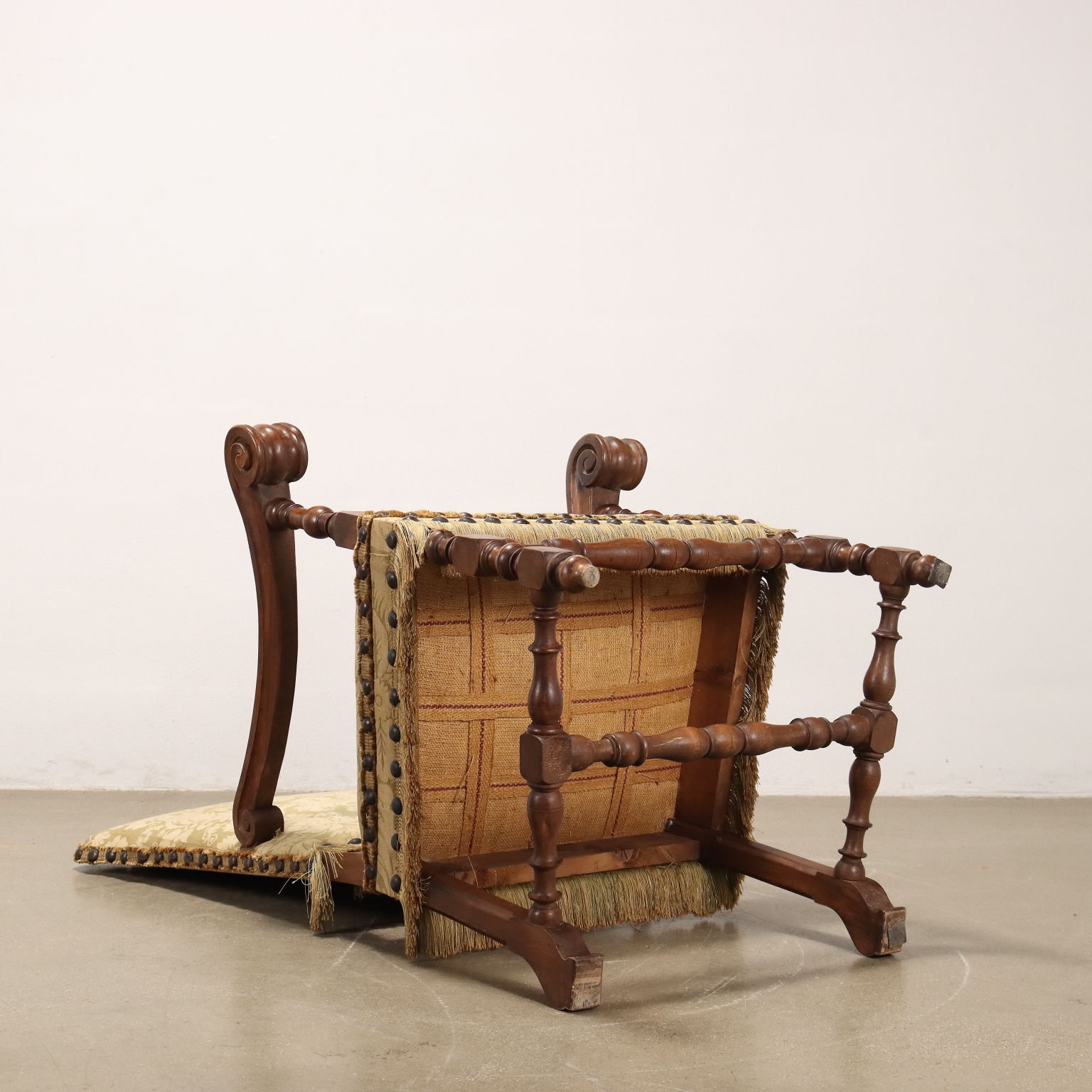Group of four baroque style armchairs, Italy, late 19th - early 20th century. Armrests ending in curls, spool legs; backrests and seats padded and covered in brocade fabric fixed with studs.