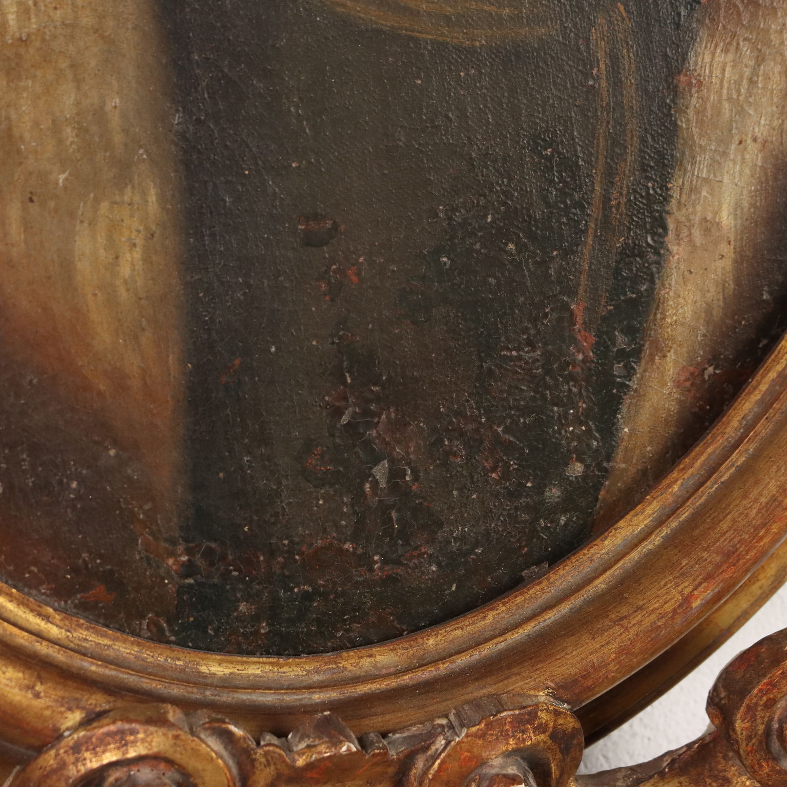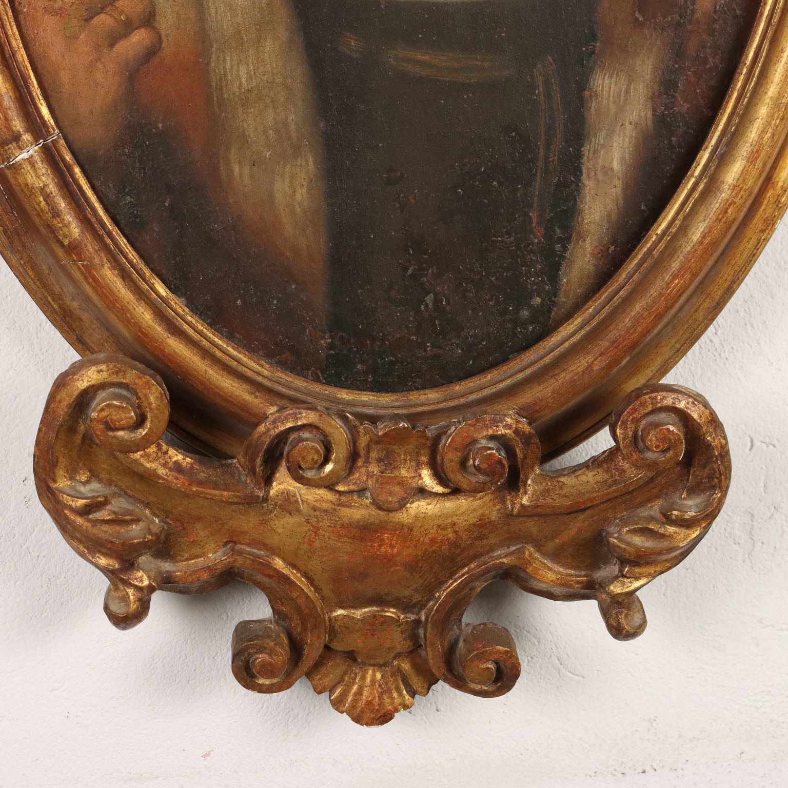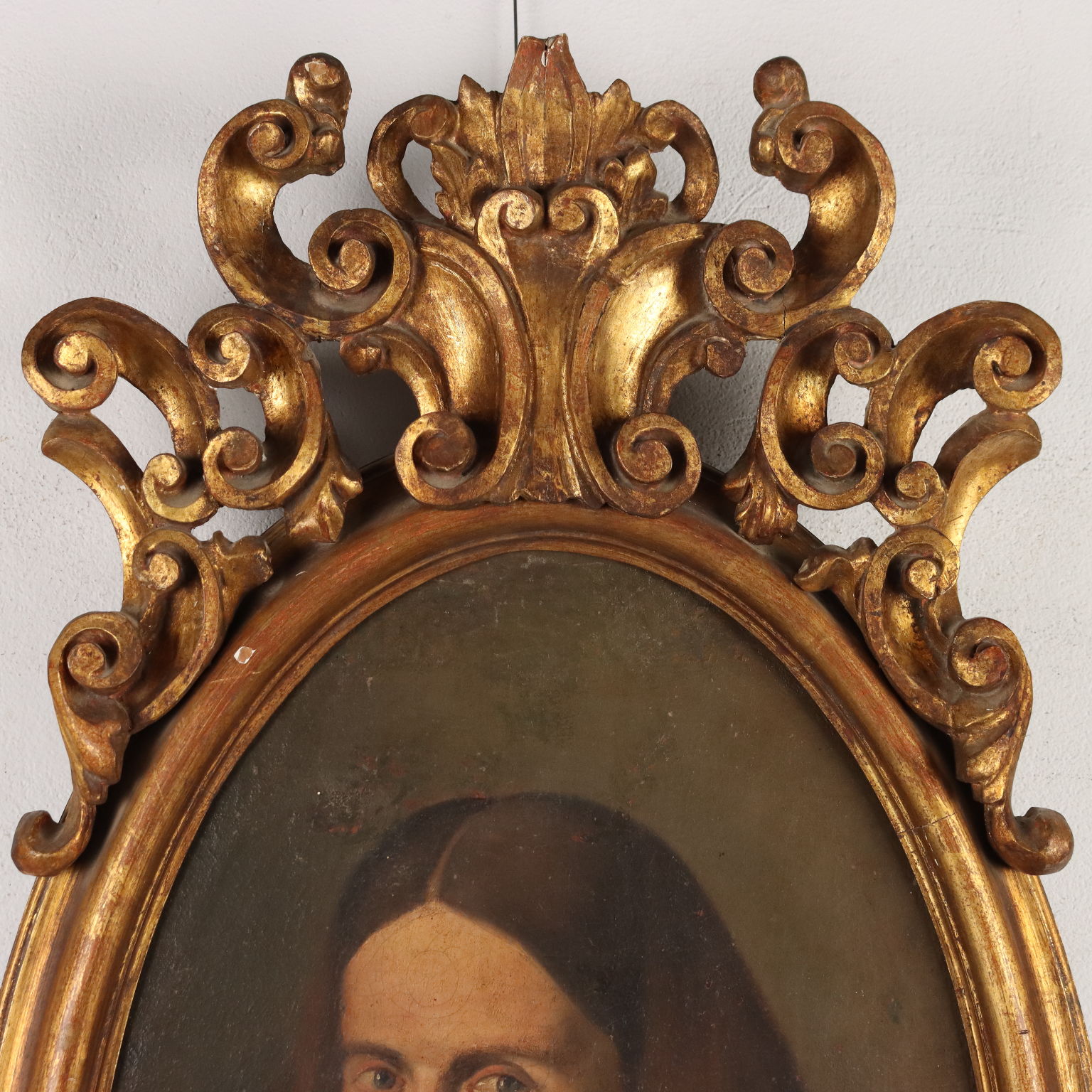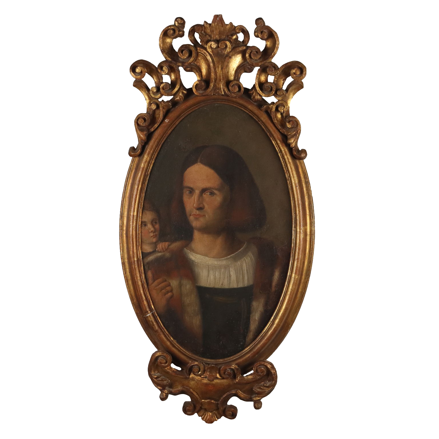 Oil painting on canvas. Italian school of the 17th century. The oval portrait features the bust of a gentleman, pointing with his thumb at the child peering over his shoulder. The painting, relined, is presented in a carved and gilded frame from the early 1900s.