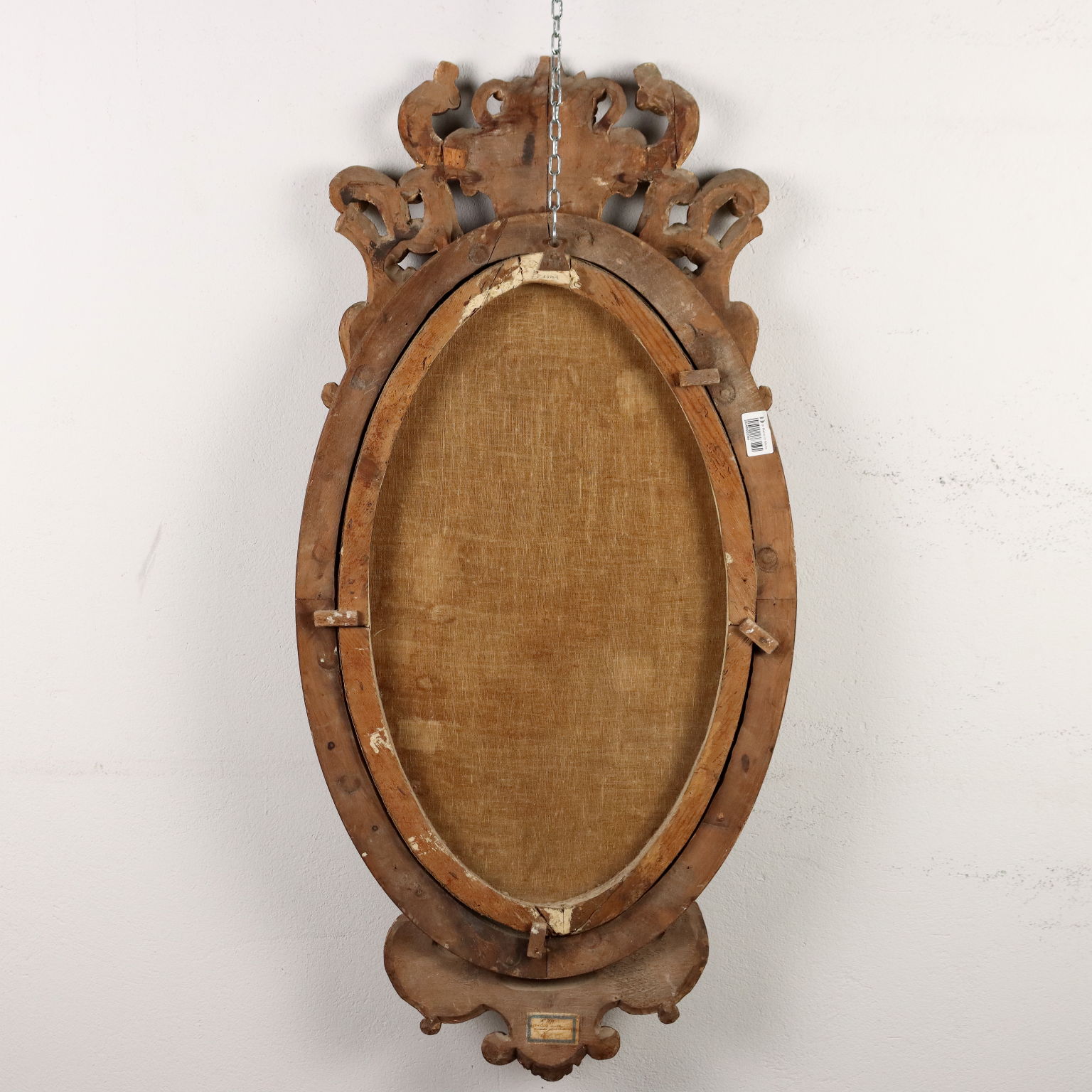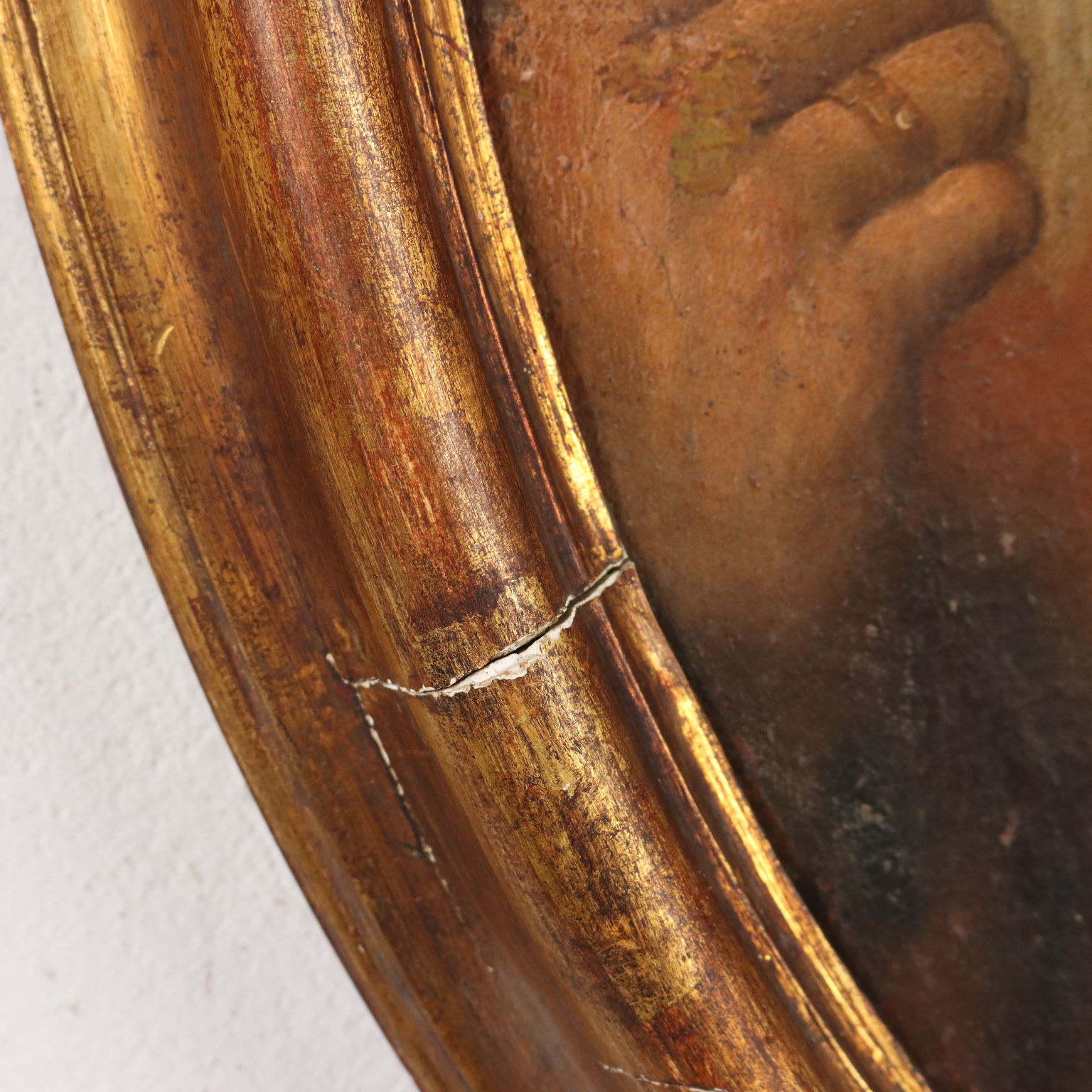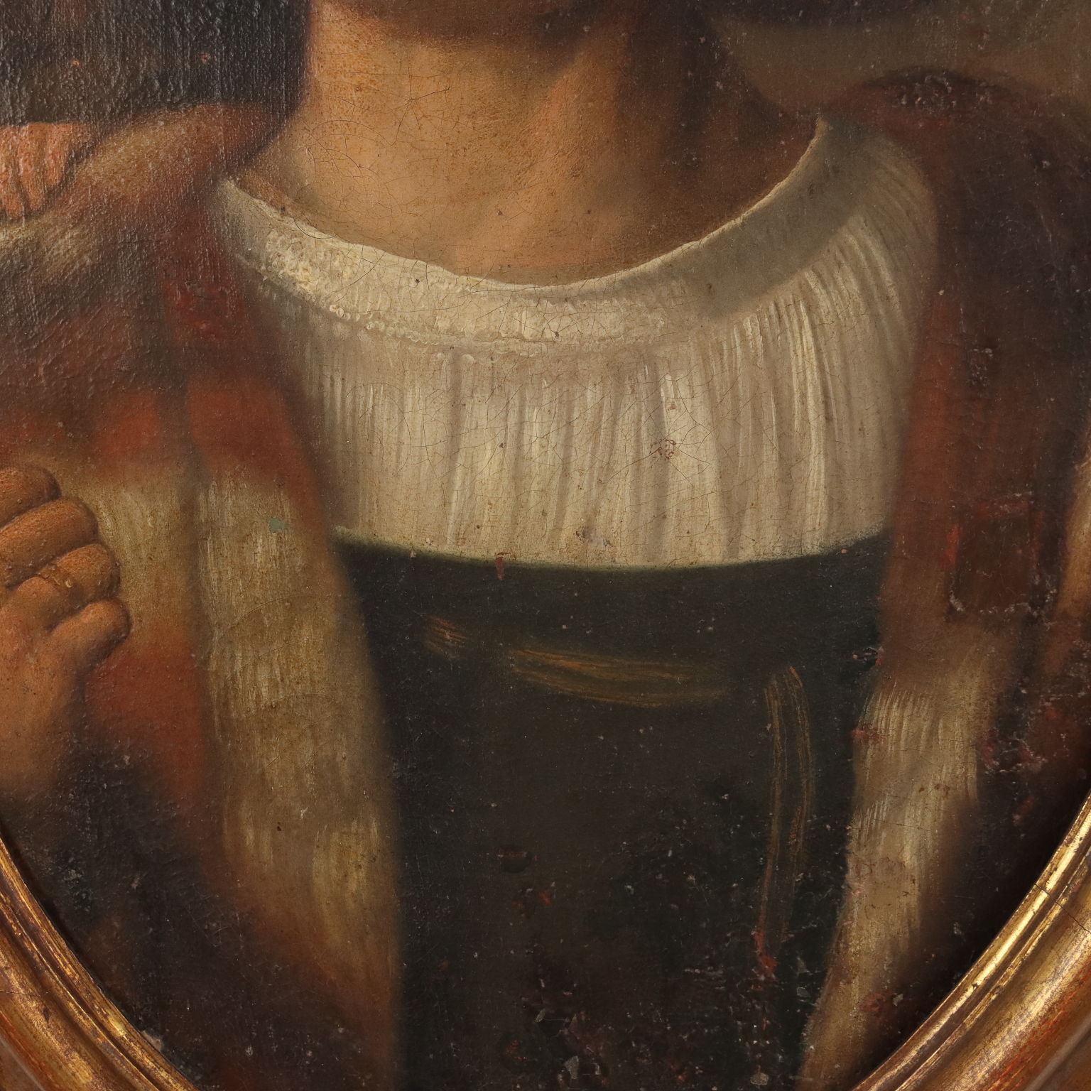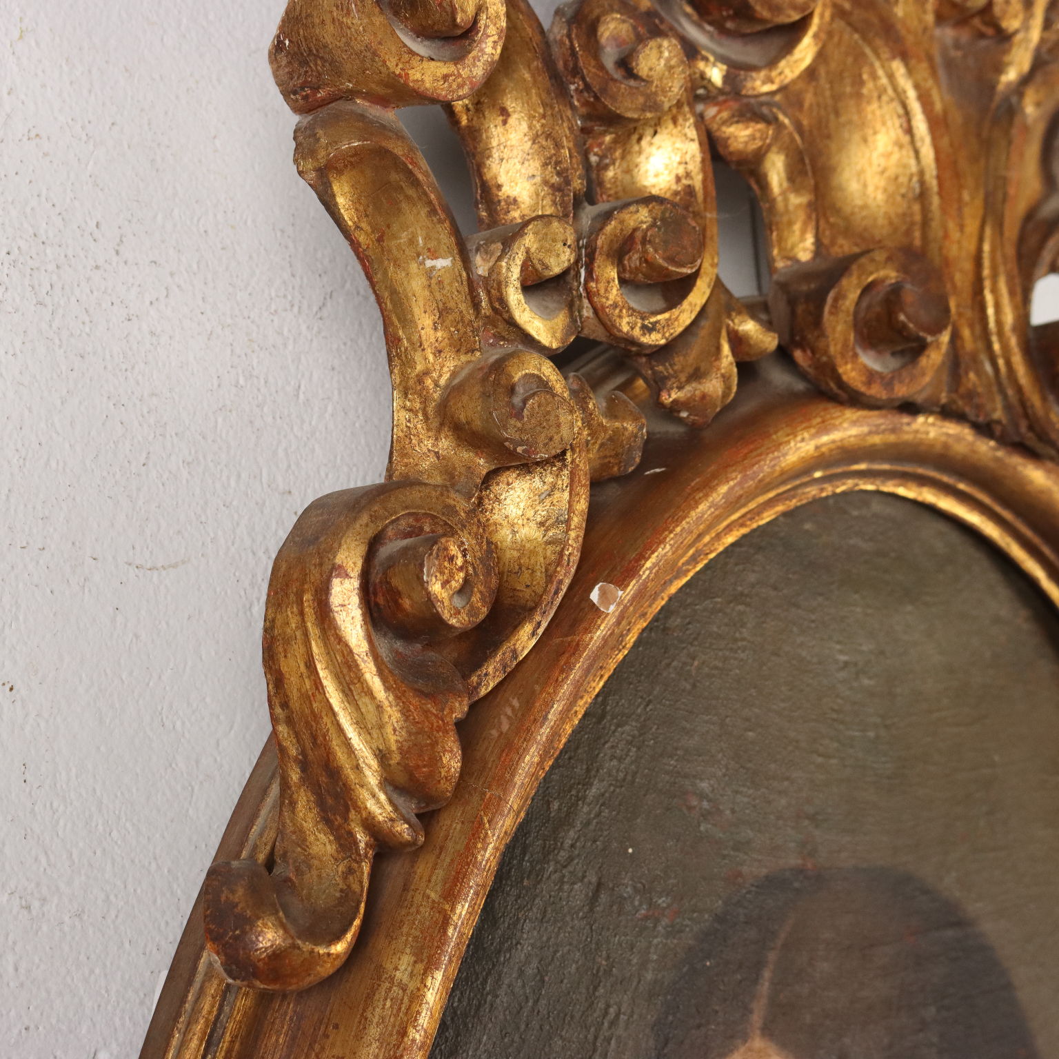 Oil painting on canvas. Italian school of the 17th century. The oval portrait features the bust of a gentleman, pointing with his thumb at the child peering over his shoulder. The painting, relined, is presented in a carved and gilded frame from the early 1900s.