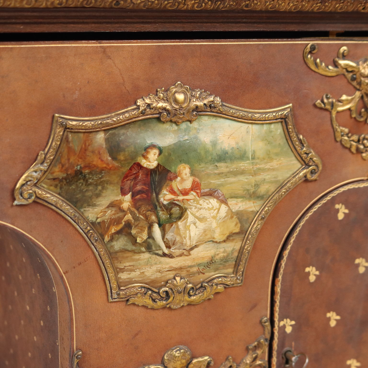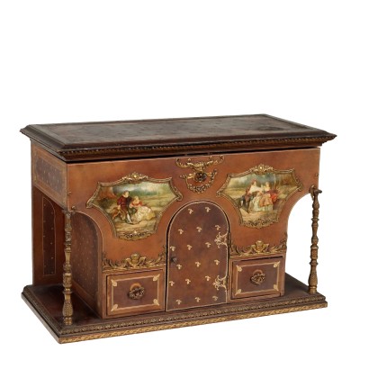 Wooden vanity case covered in imitation leather paper. Columns and applications in bronze. In the reserves paintings with gallant scenes. On the front there are two drawers and a door and the interior of the upper compartments is covered in green fabric.