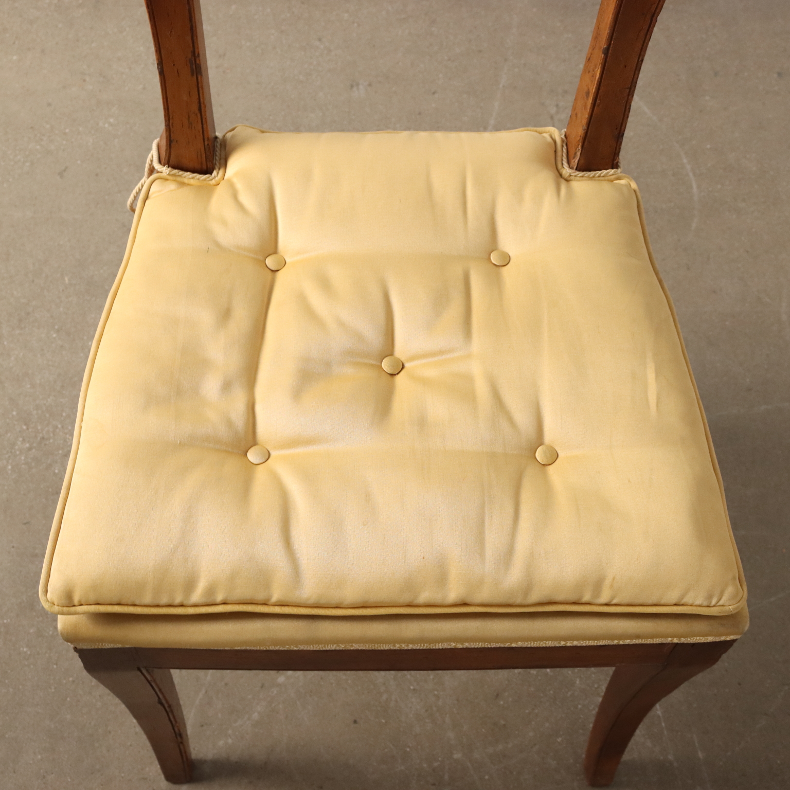 Pair of walnut directoirechairs, Lombardy, late 18th - early 19th century. Open back decorated with a geometric pattern, saber legs. Padded seats equipped with removable cushion.