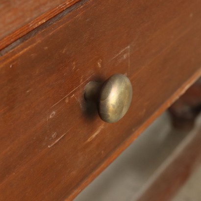 Working table supported by turned legs connected by crosspieces, in the under-counter band it has five drawers on each long side and one on the short ones. In fir, it has bands in the oak top, while the front of the drawers is in poplar.