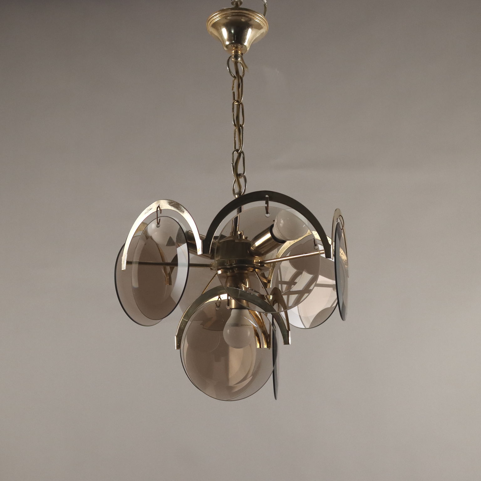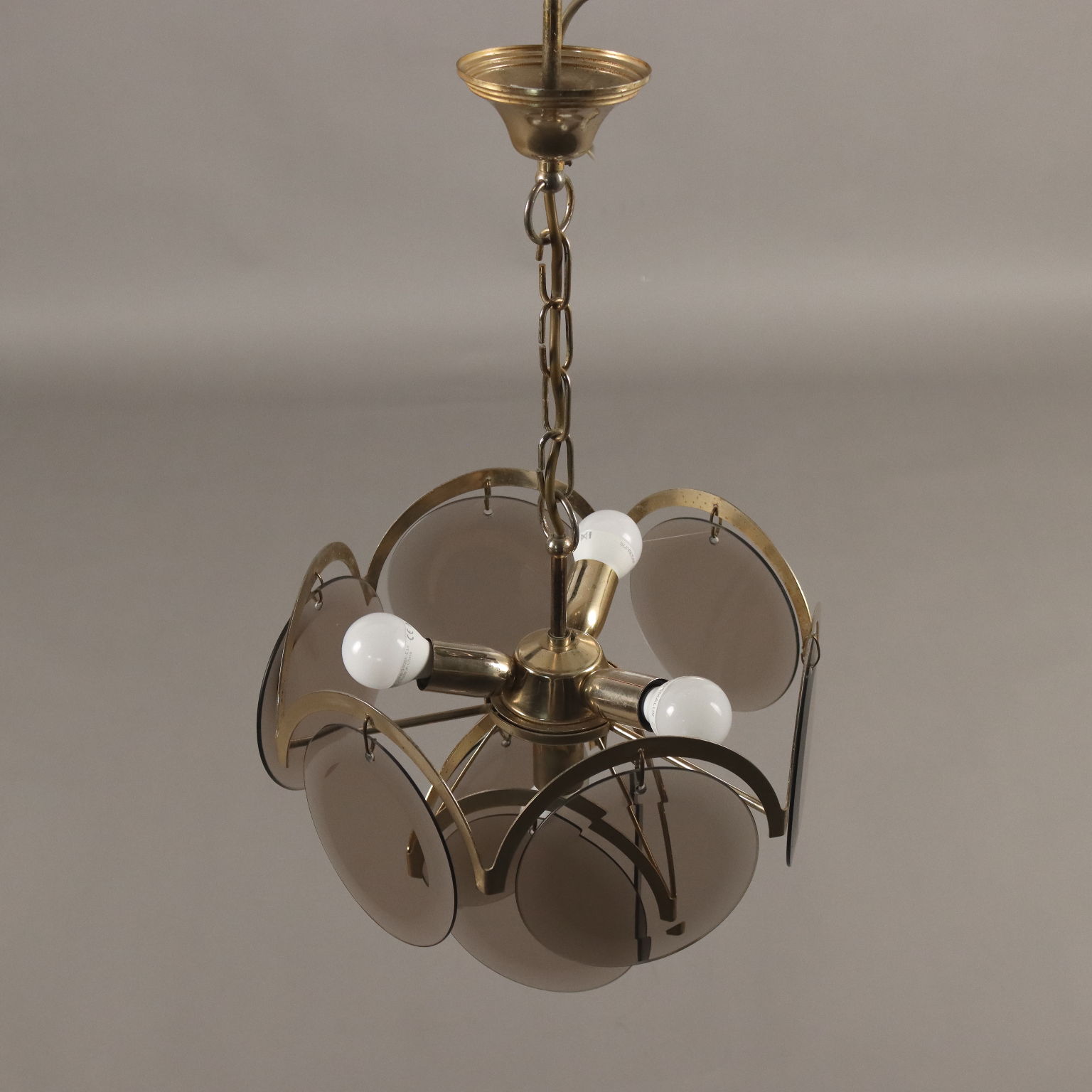 Ceiling lamp with golden metal frame and smoked glass disc pendants.