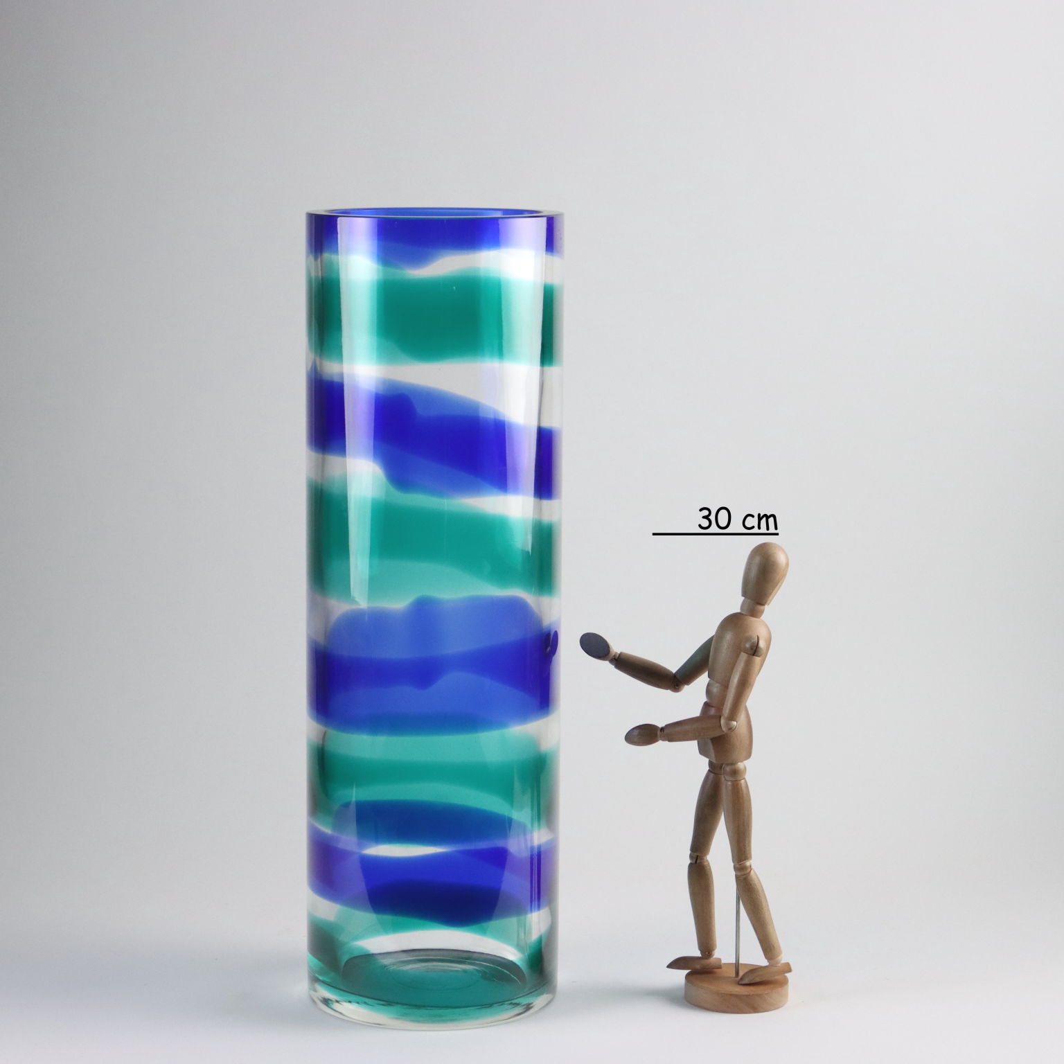 Transparent glass vase with horizontal bands in shades of green and blue. Pointed signature of the manufacturer under the base and adhesive label on the edge.