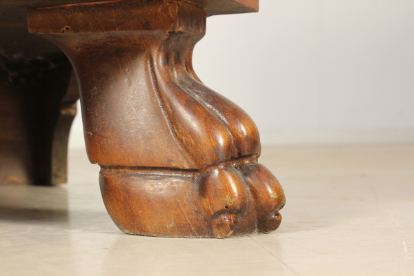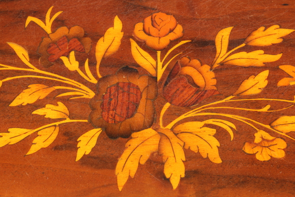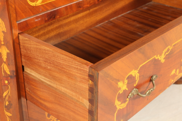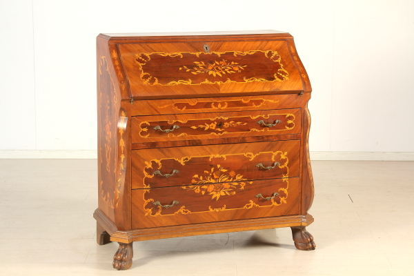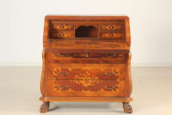 Inlaid tilt. Features three drawers and drop-leaf door move which conceals four small drawers and compartment. The pillars 45à ' ° moved and end with foot ferini. Floral inlays in various scents.
