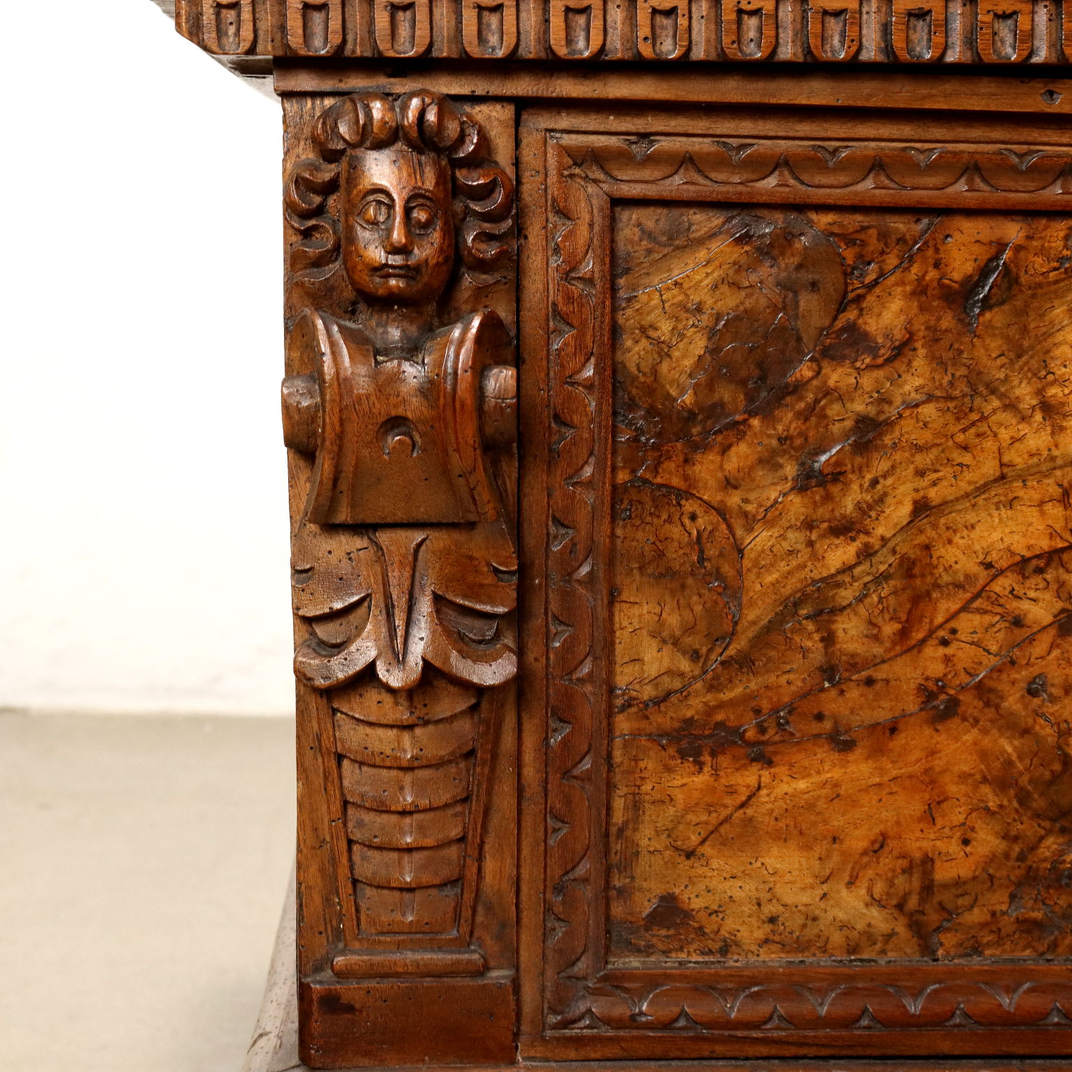 Baroque chest in walnut and walnut root slab, Italy late 17th - early 18th century. Frame under the top, front with pair of walnut root reserves, included within pilaster strips depicting caryatids; a large carved cartouche stands out in the centre. Lower section decorated with a rib-shaped Greek key and leafy elements. Minor restorations and replacements.