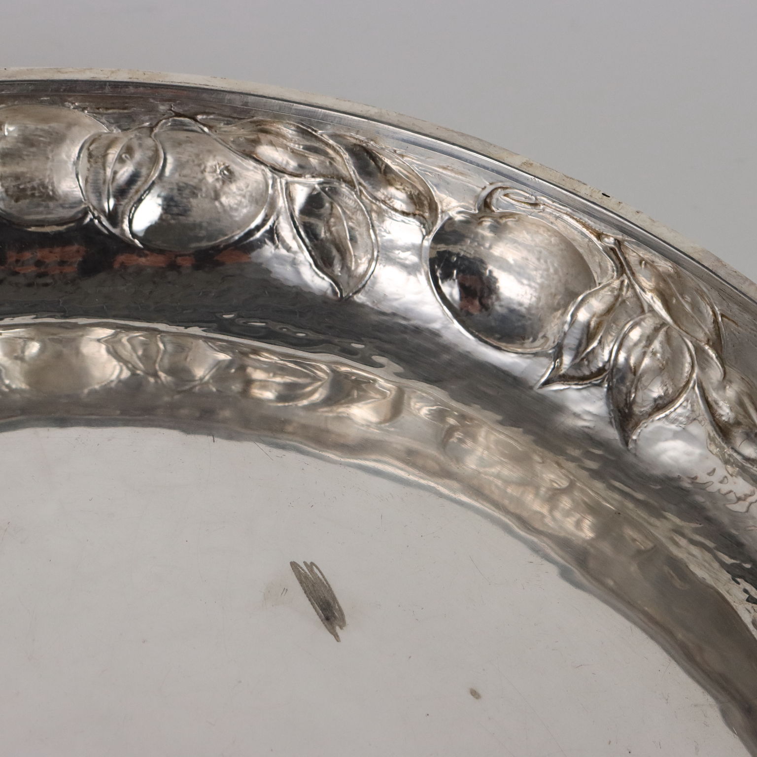 Embossed silver centrepiece with decoration depicting fruit vines. Silver and silversmith marks incised on the outer rim line. Grams 1490.